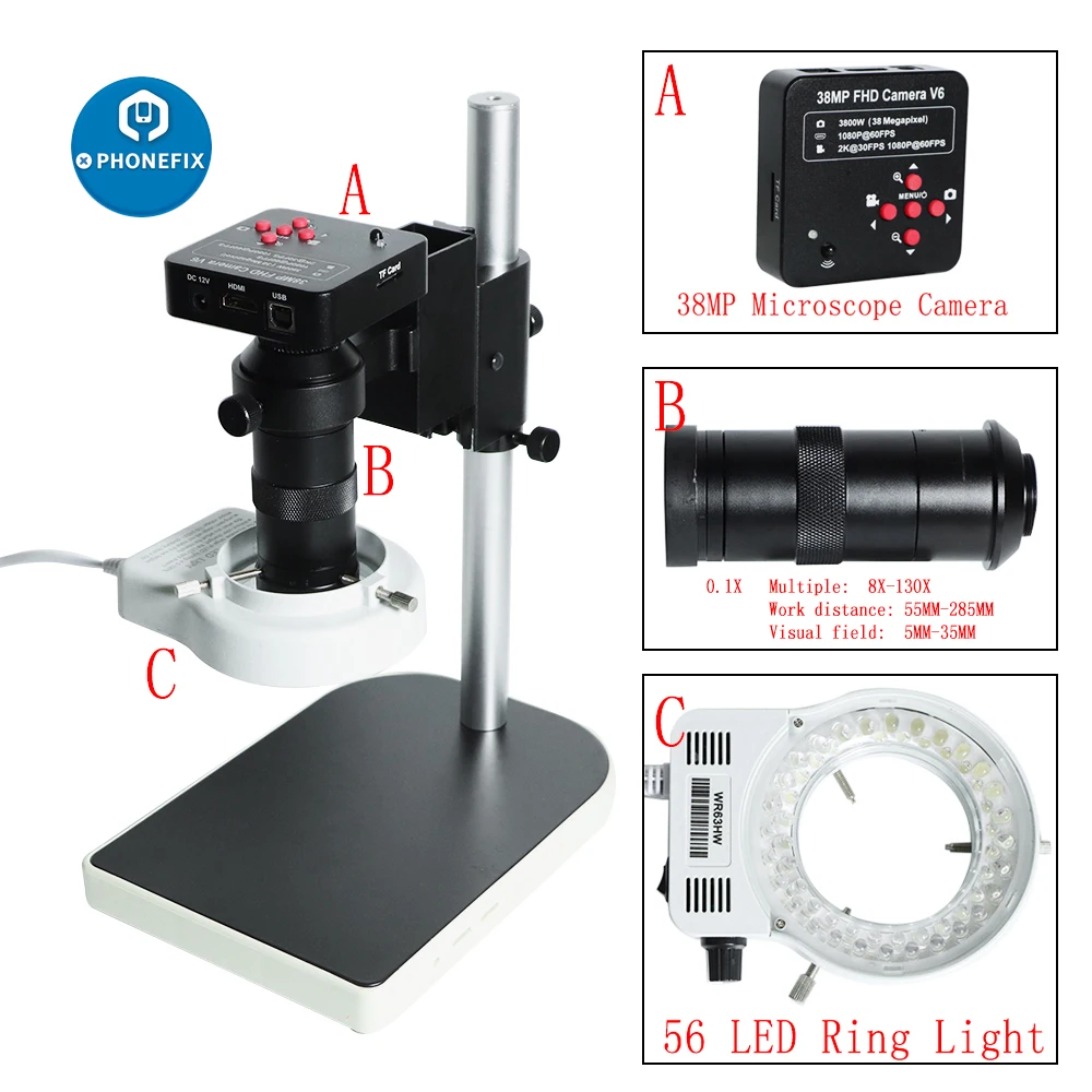 38MP HDMI USB промышленный цифровой C-Mount микроскоп камера TF Видео Recoder DVRНабор для пайки камеры с цифровым микроскопом HD: камера + объектив с креплением 130X C (0,1x) + светодиодный кольцевой светильник 56 + подставка