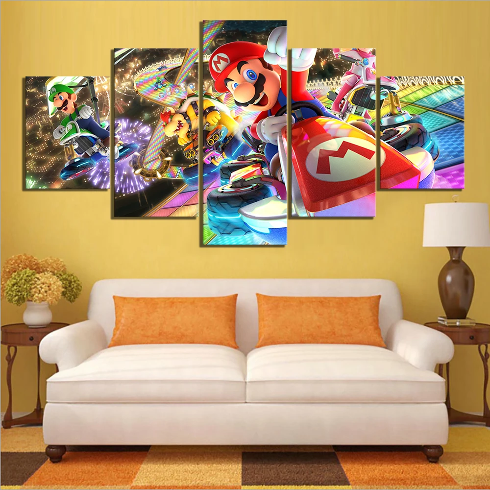 Настенный плакат на холсте, модульные картины, 5 шт., картины в стиле Марио, картины из мультфильма, HD картины, домашний декор для гостиной с рамкой