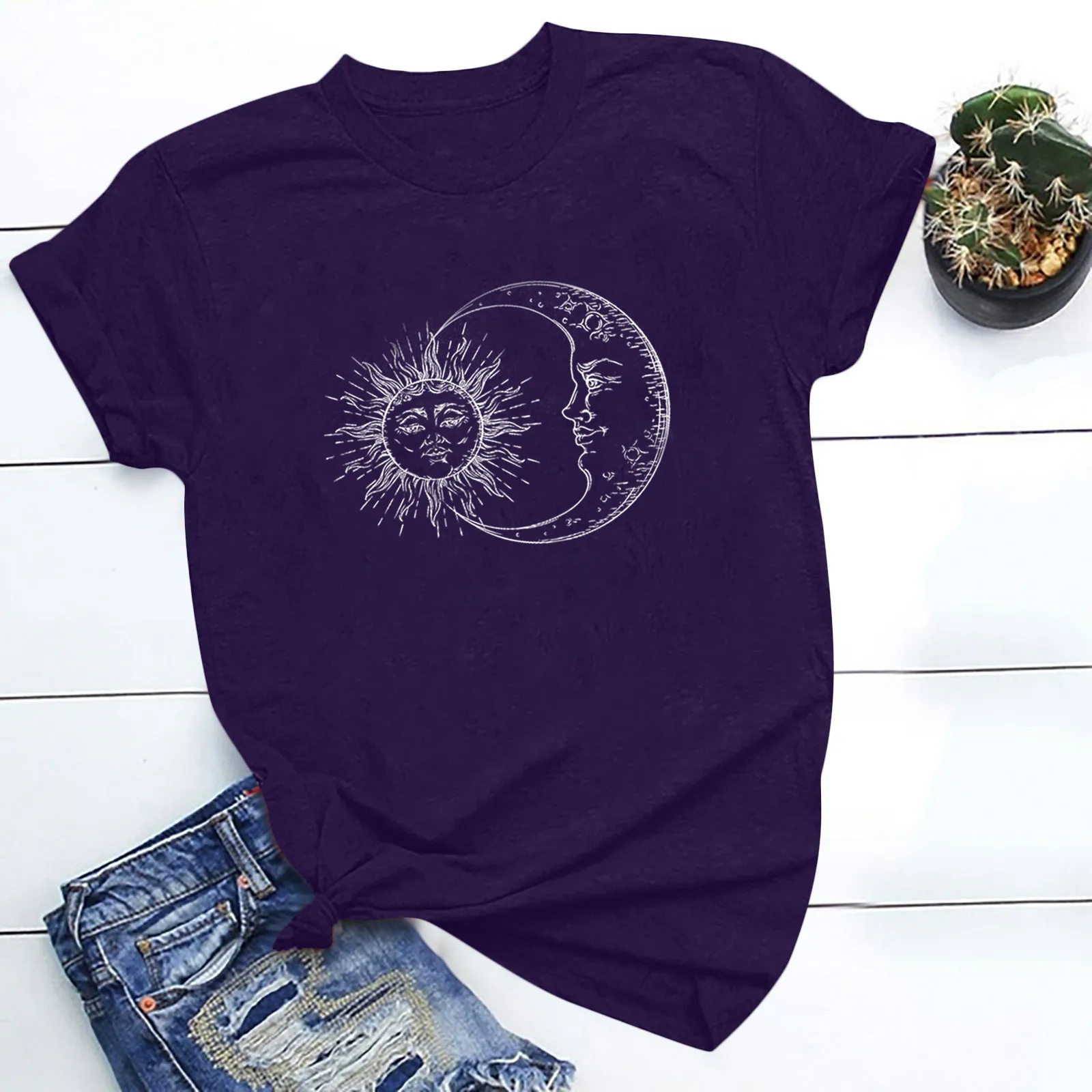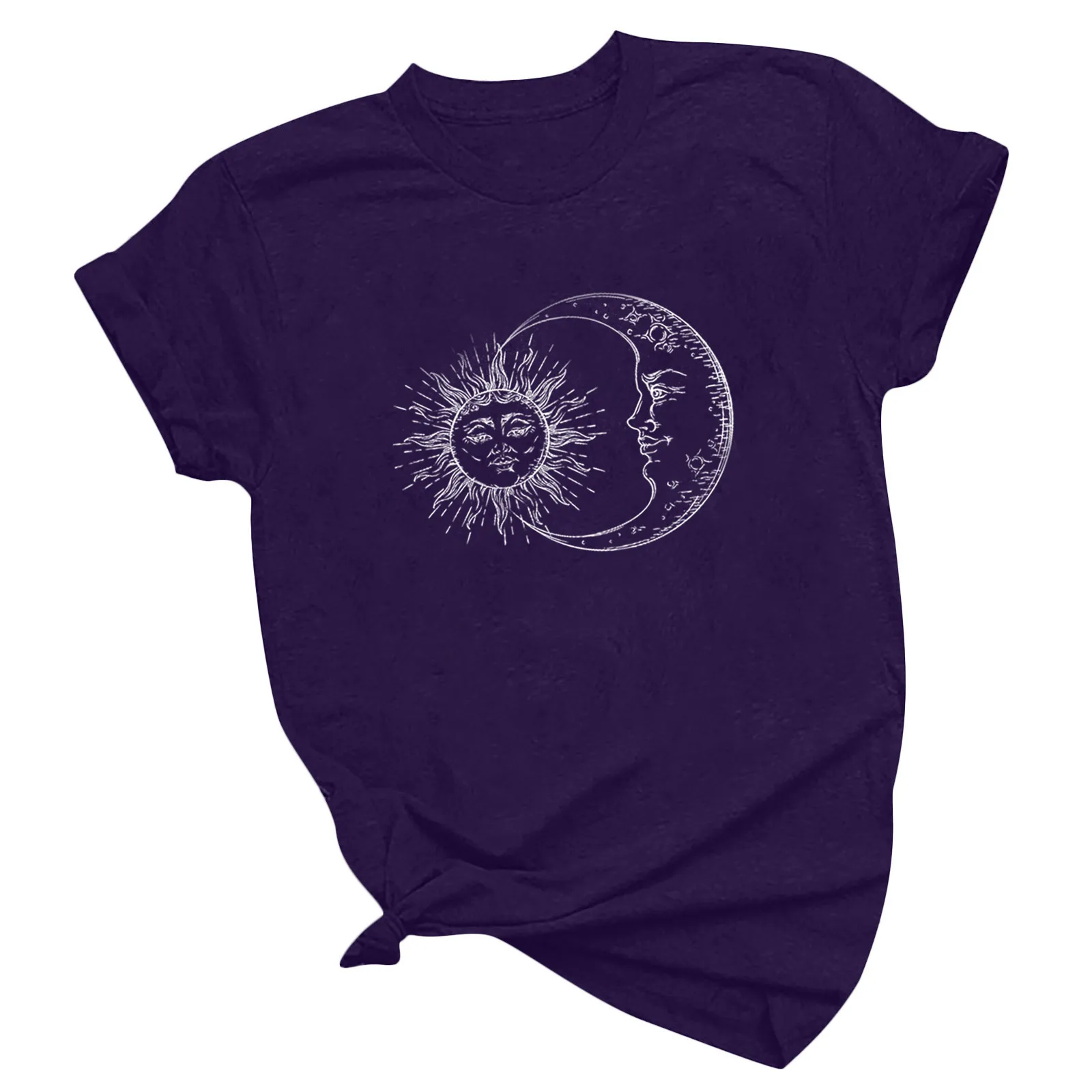 Винтажные Универсальные Женские Футболки 40 #, повседневные однотонные Футболки с принтом Солнца и Луны, топы с коротким рукавом