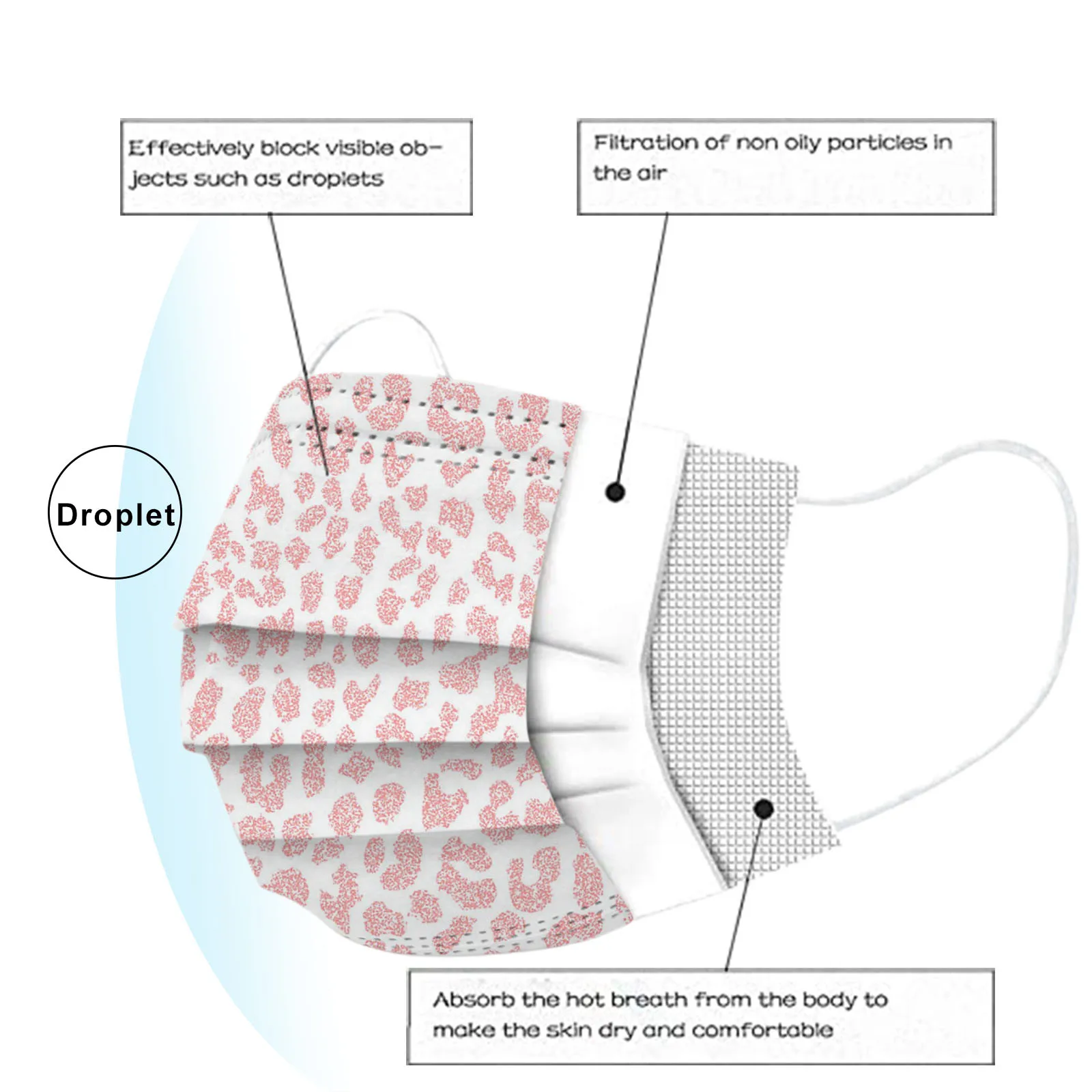 В 3 слоя Нетканая одноразовая маска изготовлена из 3 слоев нетканого материала, Безопасен и безопасен для использования. Дышащий материал и милый Узоры, которые делают его полезным и модным. Специальный 3 слоя из нетканого материала Дизайн, обеспечивает некоторую защиту от пыли, автомобильных выхлопных газов, Пыльца и т. д. эластичная Ушная петля, легко носить и не давит на уши. Маникюрный салон или любые другие области, где может потребоваться защита
