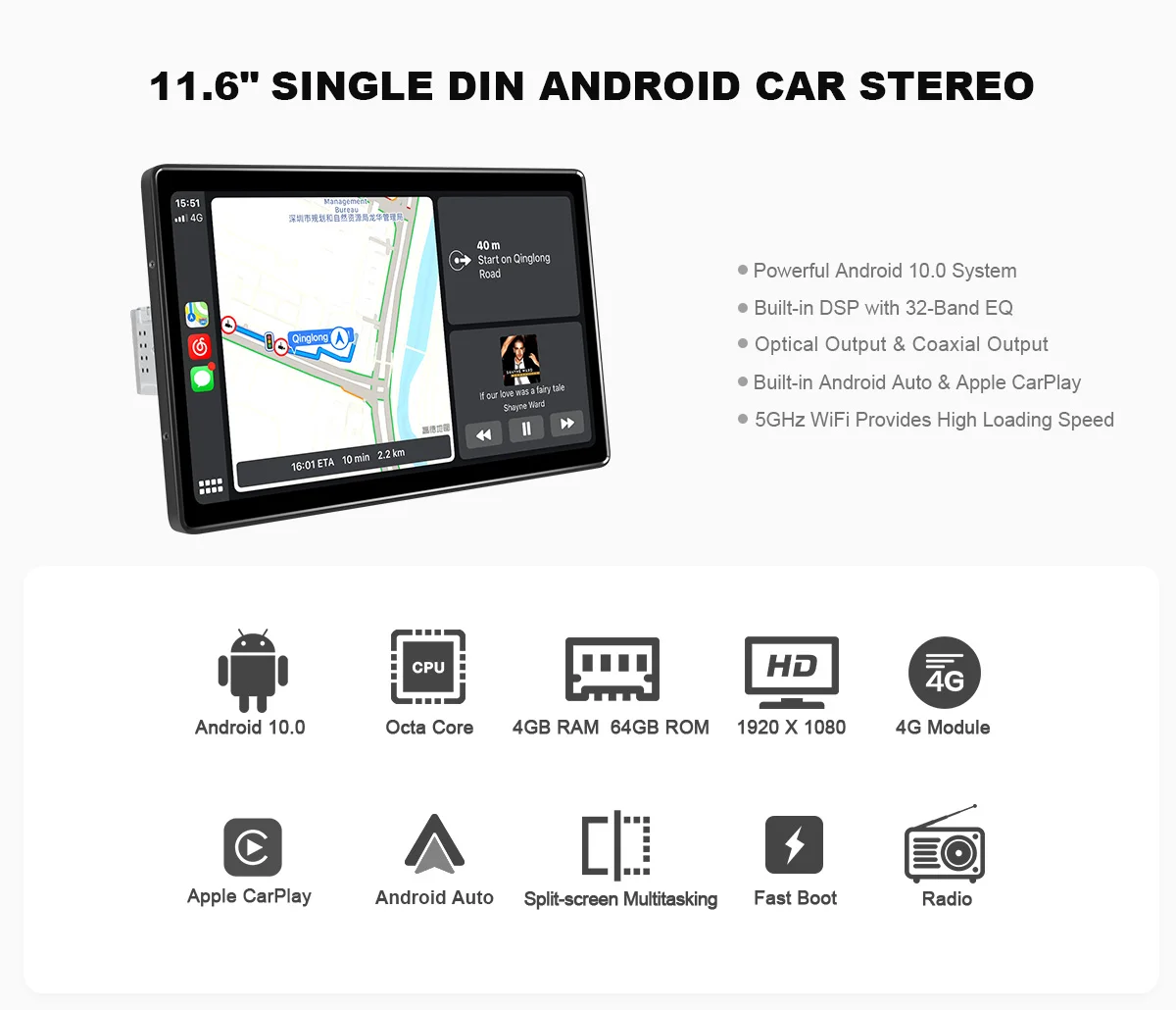 1) Операционная система: Android 102) Процессор: UIS7862 Восьмиядерный 1,8 ГГц3) радиочип: TDA77864) чип усилителя: TDA78515) Встроенный Android Auto & Apply Carplay.6) Встроенный слот для sim-карты.7) оптический выход и коаксиальный выход.8) Встроенный DSP с 32-полосным эквалайзером.