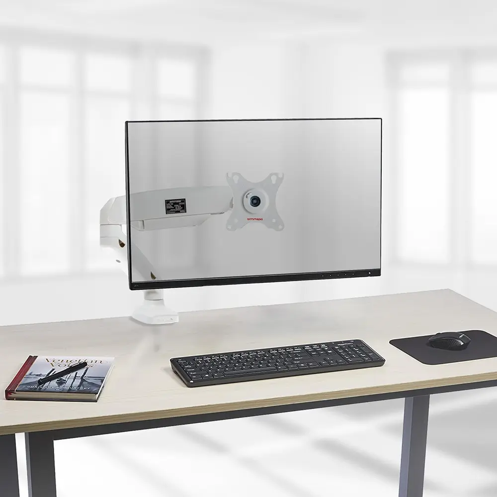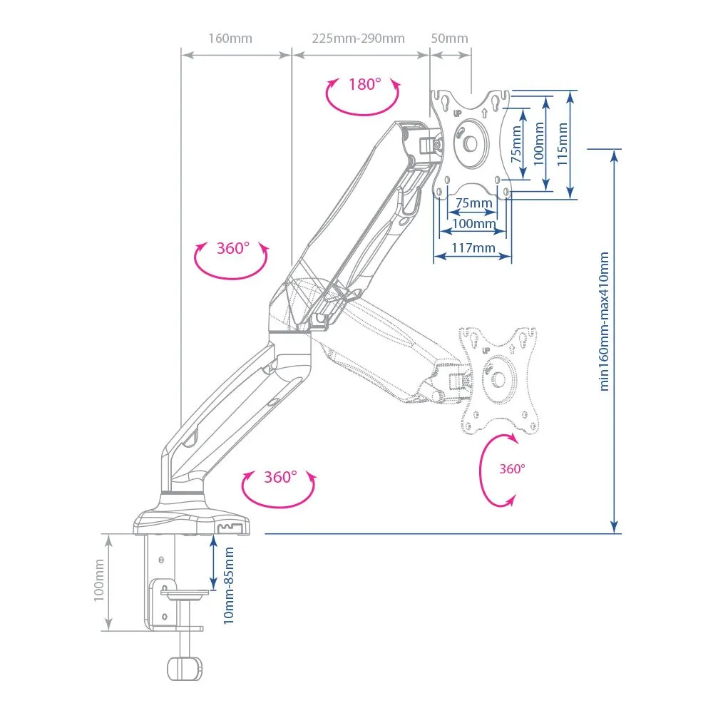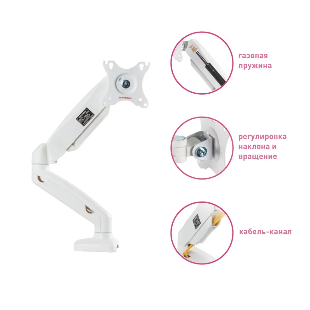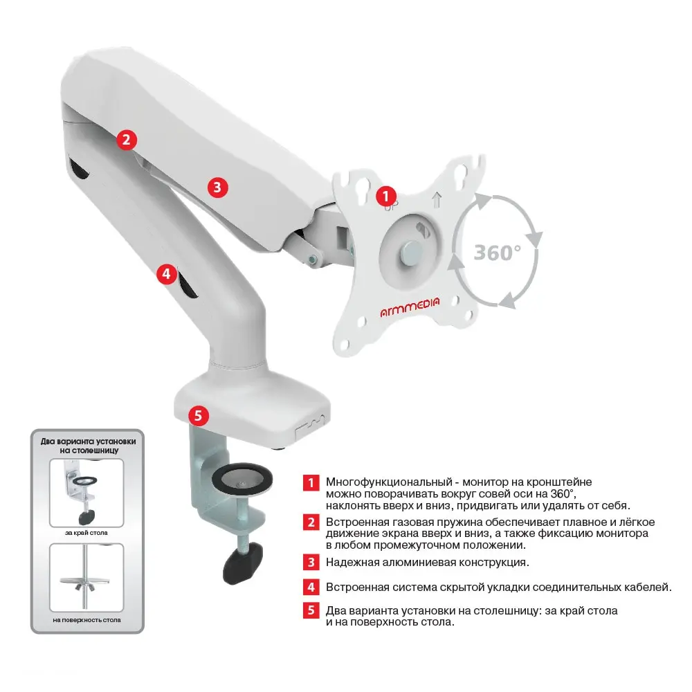 За счет встроенной двухколенной газовой пружины, которая настраивается под вес любого монитора, Вы можете зафиксировать экран в любом удобном промежуточном положении, плавно перемещая экраны вверх и вниз в пределах 325 мм. Еще одним из плюсов данного кронштейна является то, что закрепить его можно любым из двух удобных для вас способов:- Зажав столешницу струбциной – это позволит переносить его впоследствии в другое место, не повредив при этом покрытие стола. Зажим-струбцина крепится за край стола толщиной до 85 мм.- Прикрутив к столешнице на крепления из комплекта кронштейна – это позволит вам закрепить его максимально надёжно и быть уверенным в том, что он уже никуда не денется. Зажим-винт крепится через отверстие в столе, толщиной до 100 мм.