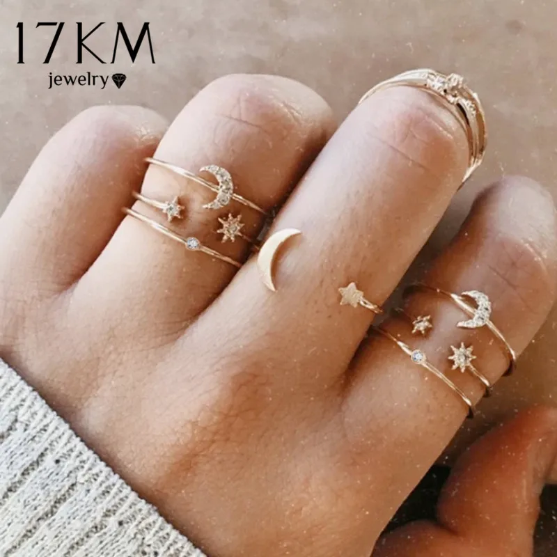 Набор женских колец с золотой Луной и звездой, винтажное металлическое кольцо с цепочкой 17 км, минималистичные украшения кольца на пальцы фаланги, 2021