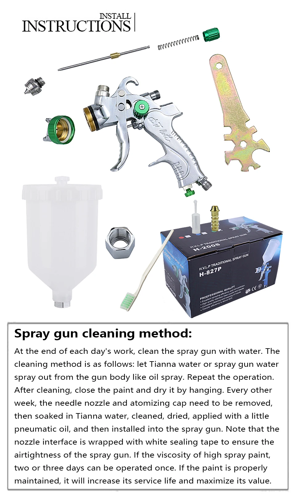 В конце каждого дня работы очистите распылитель водой. Метод очистки: дайте Tianna воду или водяной пистолет-распылитель распылить из тела пистолета, как масляный спрей. Повторите операцию. После очистки закройте краску и высушите ее, подвешивая. Каждую неделю необходимо удалить игольчатый сопло и распылительный колпачок, затем замочить в воде Tianna, очистить, высушить, нанести небольшим пневматическим маслом, а затем установить в распылитель. Обратите внимание, что интерфейс сопла завернут белой уплотнительной лентой для обеспечения герметичности распылителя. Если вязкость краски с высокой краской, два или три дня можно использовать один раз. Если краска будет правильно сохранена, она увеличит срок службы и максимизирует ее стоимость.