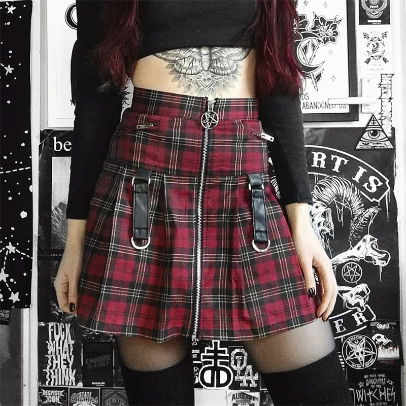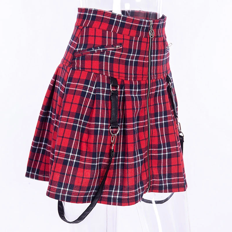 Mall гот, эмо эстетичная красная клетчатая плиссированная мини-юбка Egirl для женщин кавайная юбка с завышенной талией в стиле панк-рок с пряжками E-Girl в клетку