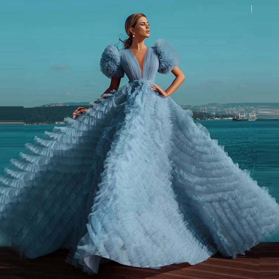 Сексуальное вечернее платье из тюля с глубоким V-образным вырезом, пышные платья для выпускного вечера Ярусное, Длинные вечерние платья без рукавов