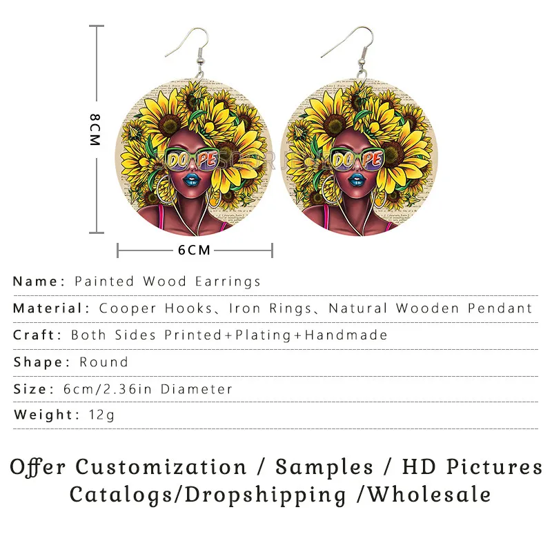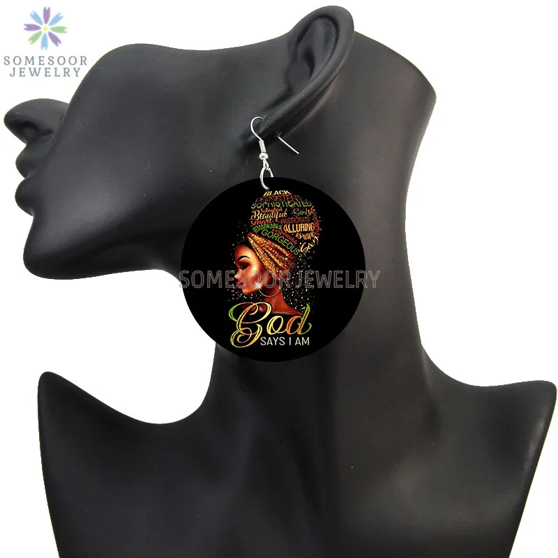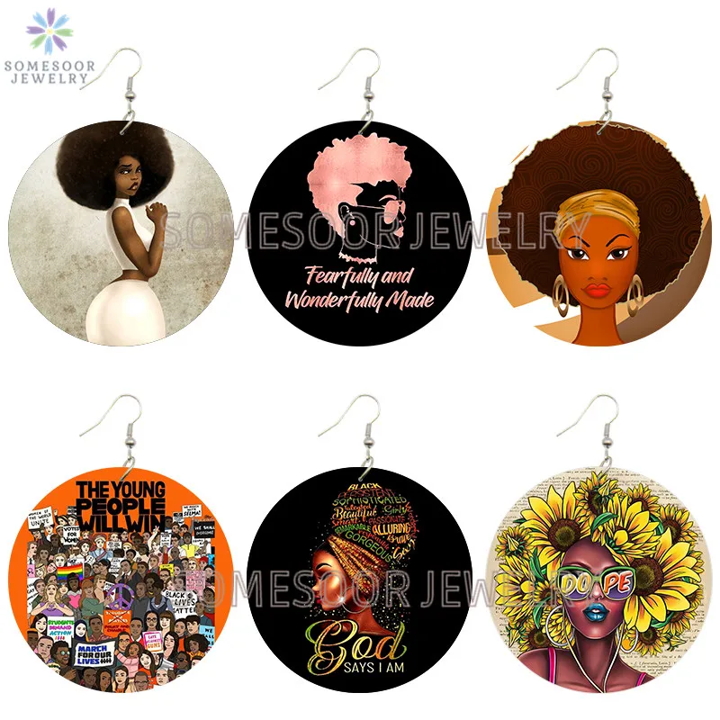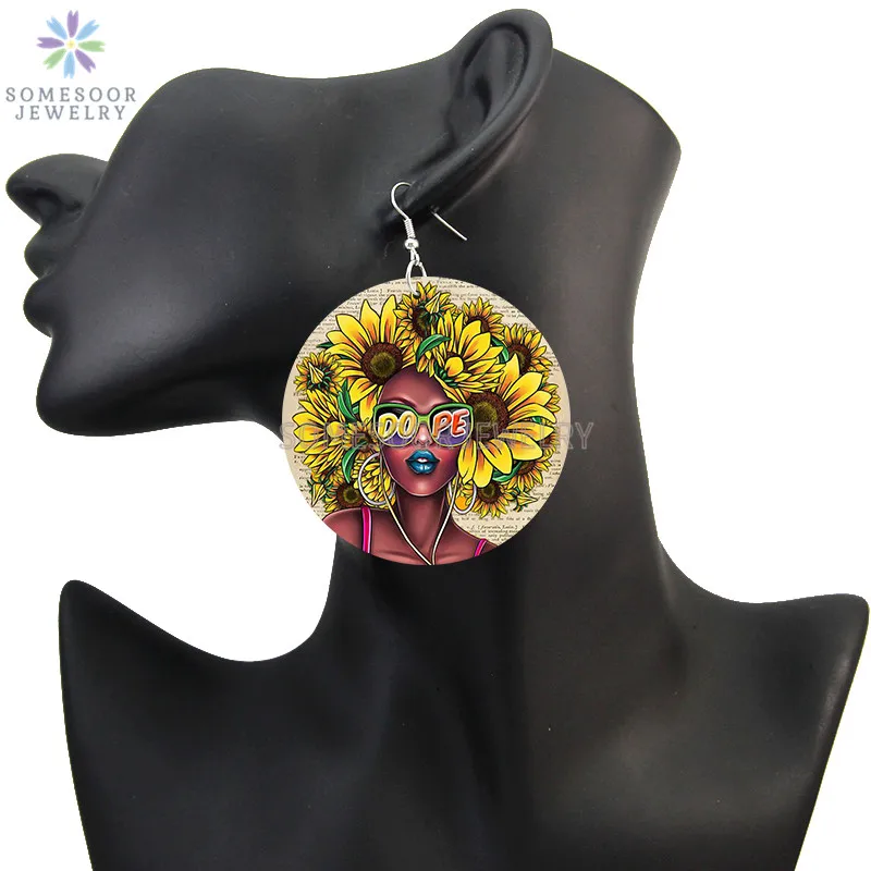 SOMESOOR подсолнухи афро натуральные волосы допинг деревянные висячие серьги чудесный принт Бог петли Висячие для женщин Подарки