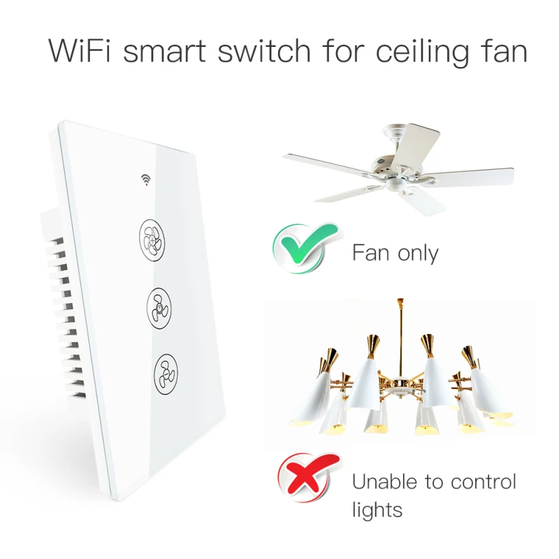 1,2/3-way multi-control association для управления 1 потолочным вентилятором с несколькими переключателями; Панель из закаленного стекла с защитой от царапин подходит для любого домашнего декора и обеспечивает легкое сенсорное управление; вы можете связать этот переключатель с несколькими различными переключателями в приложении Smart Life.