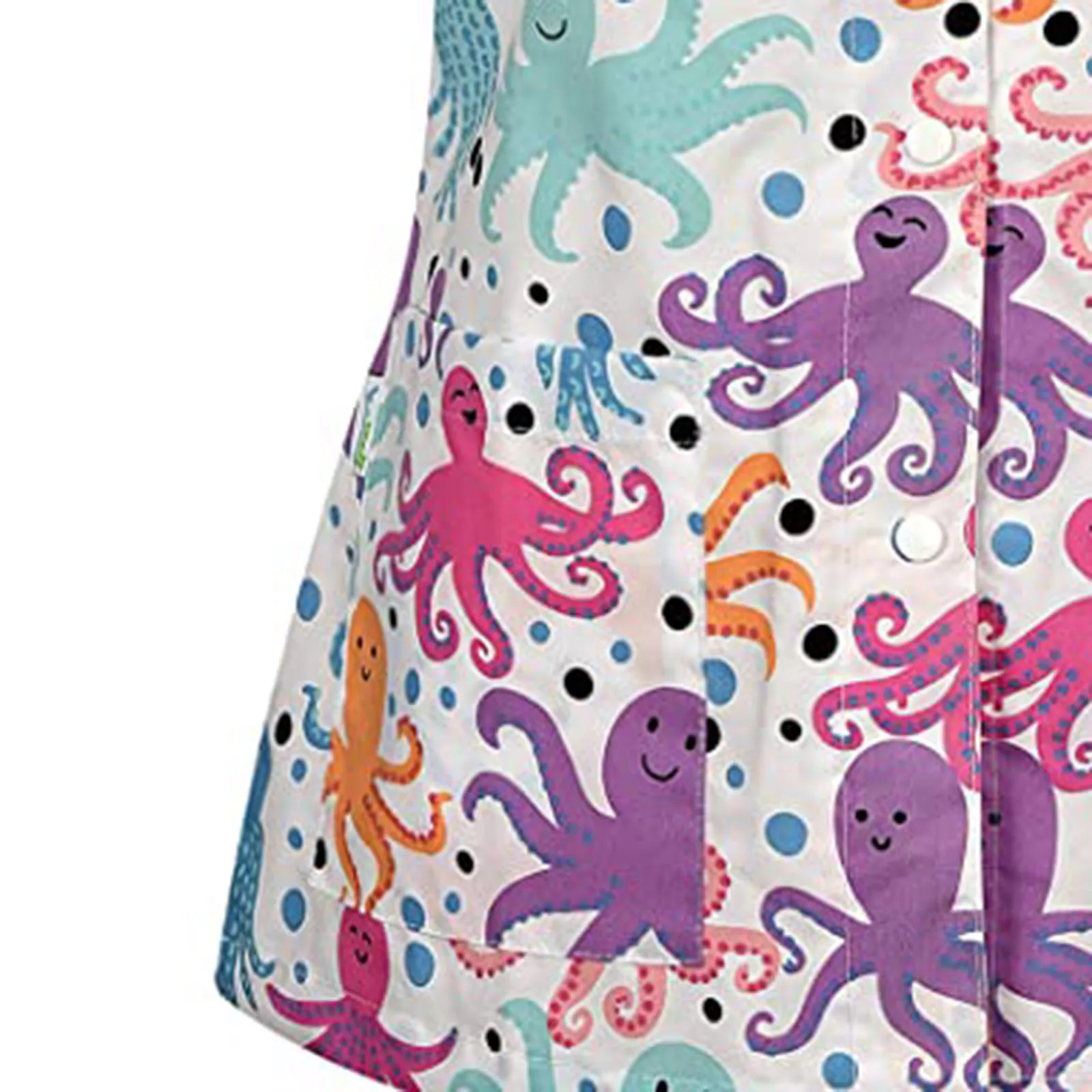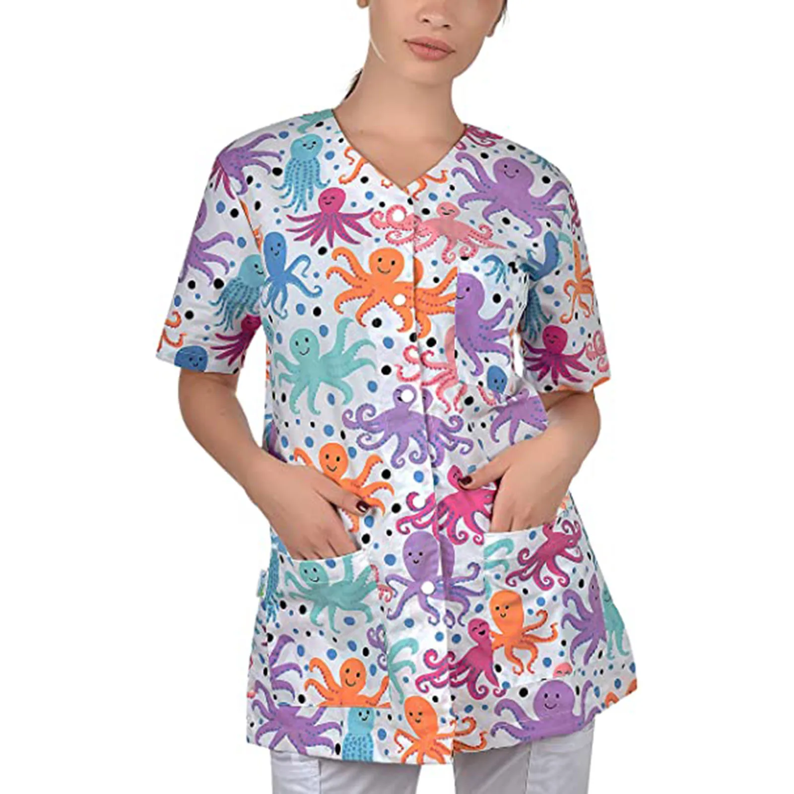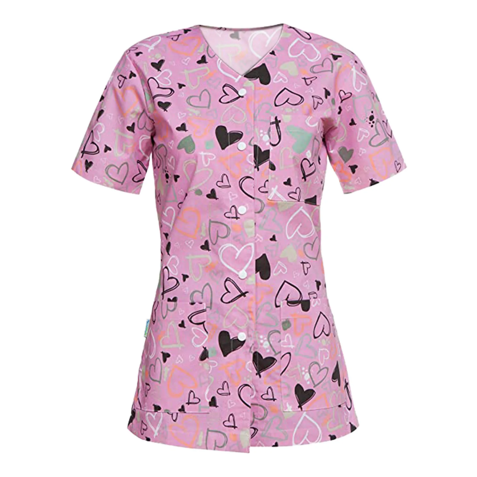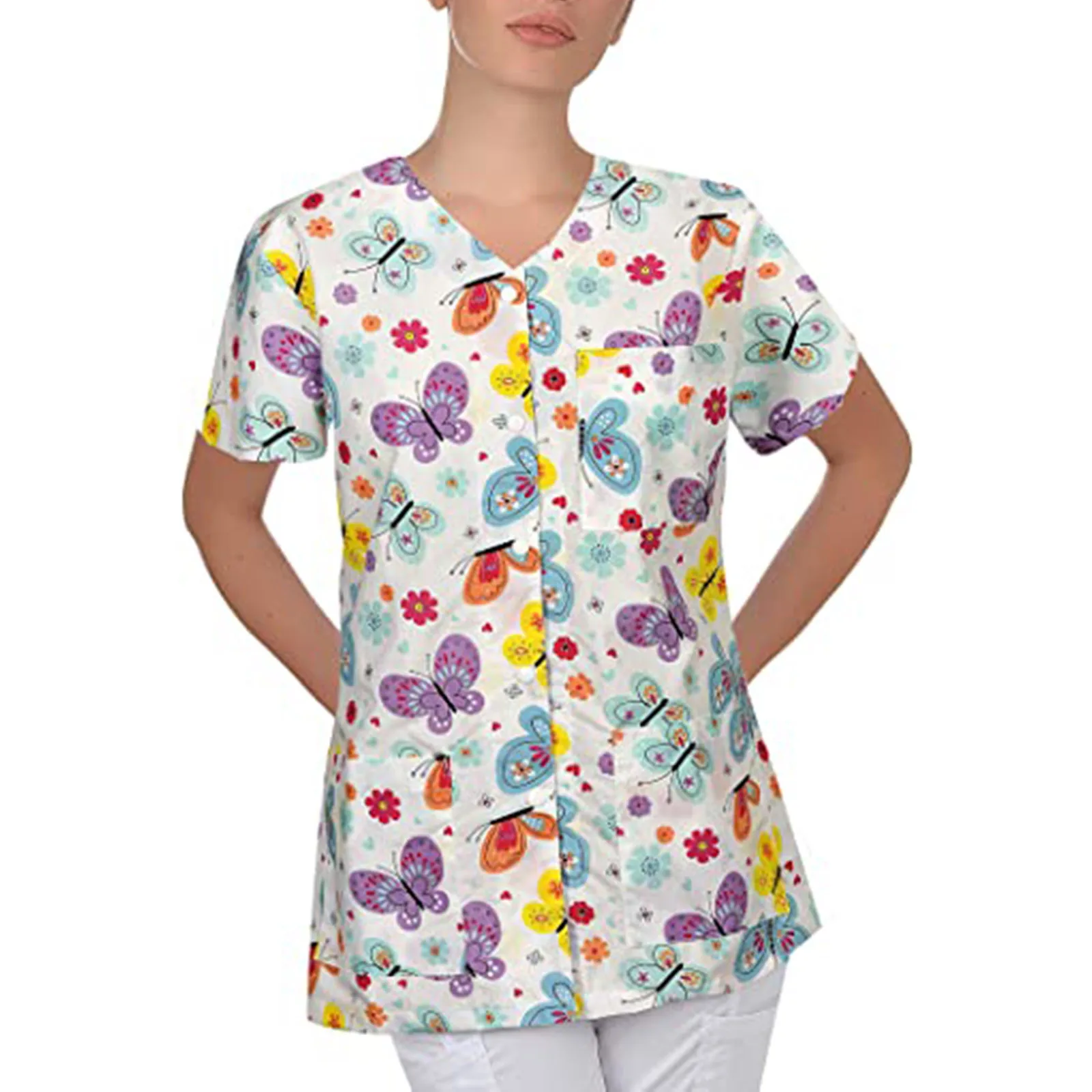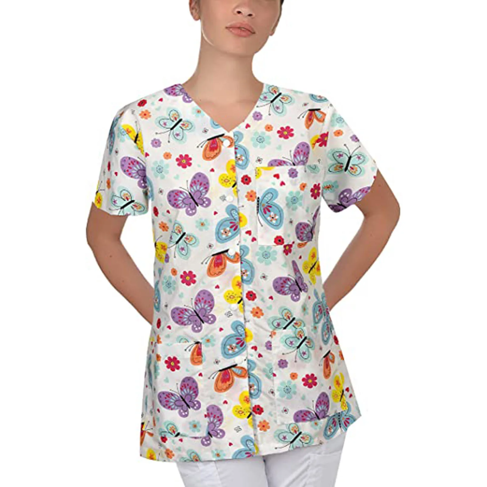 2021, Женская рабочая одежда с коротким рукавом и V-образным вырезом, топы, летняя мода, размера плюс, униформа медсестры с коротким рукавом и милым мультяшным принтом