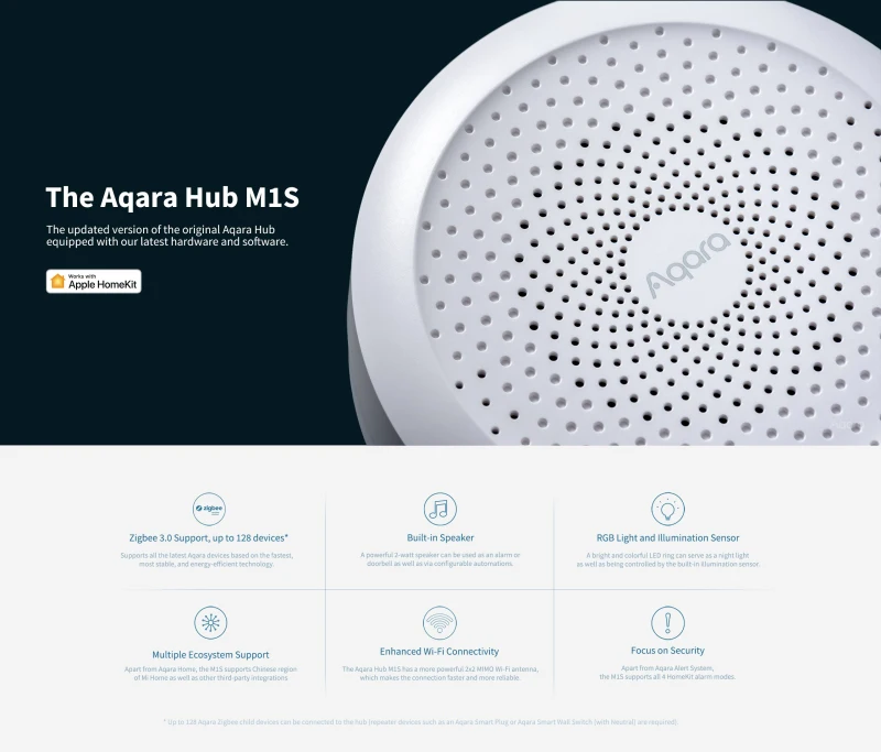 (* До 128 ДЕТСКИХ УСТРОЙСТВ Agara Zigbee могут быть подключены к концентратору (требуются ретрансляторы, такие как смарт-разъем Aqara или умный настенный выключатель Agara (с нейтральным).