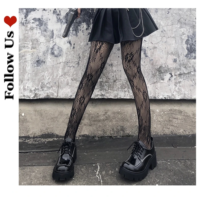 Колготки женские, черные, в стиле ретро, с розовыми цветами, сетчатые, кружевные, весна-осень