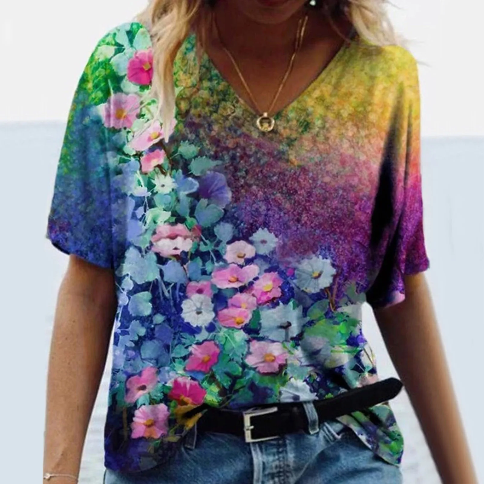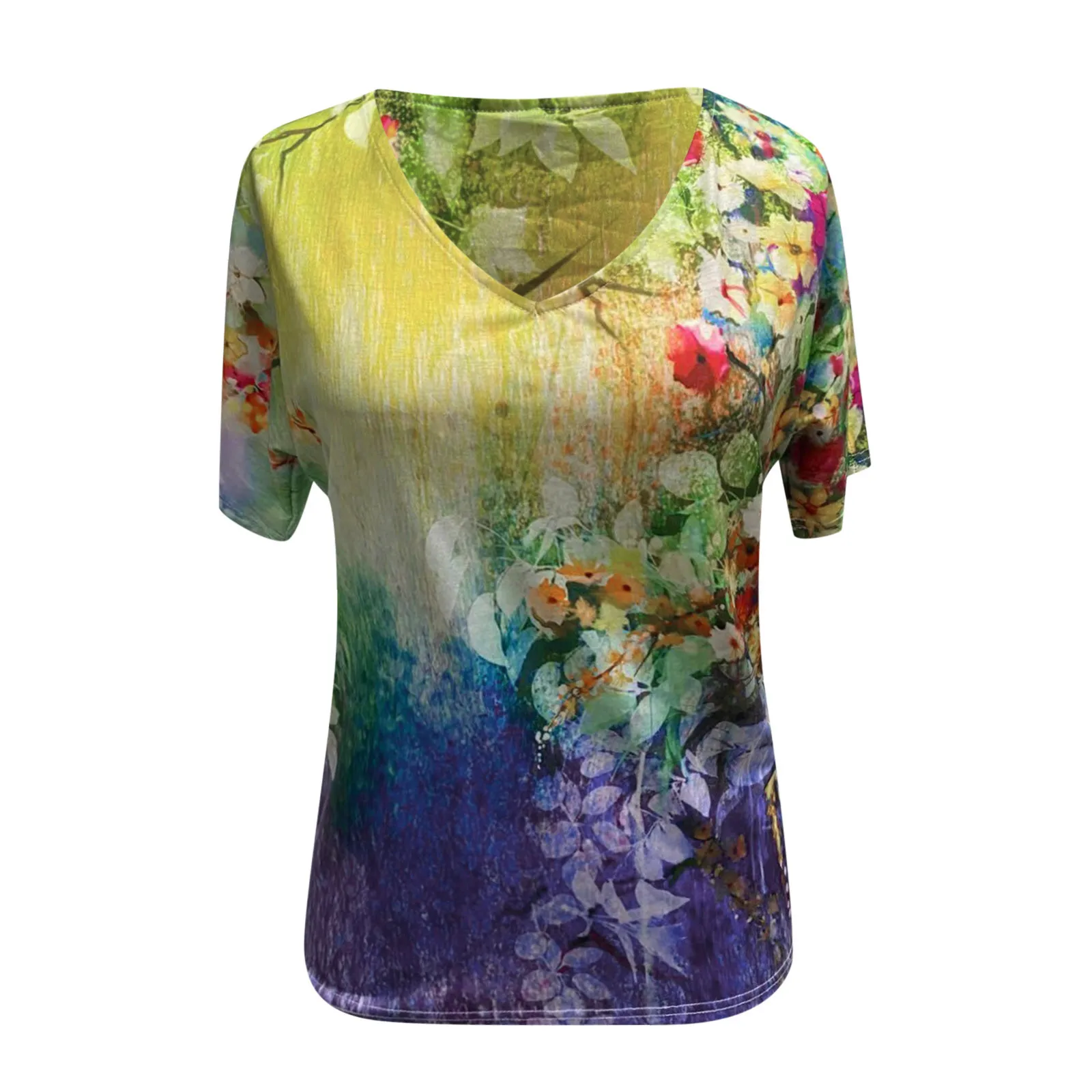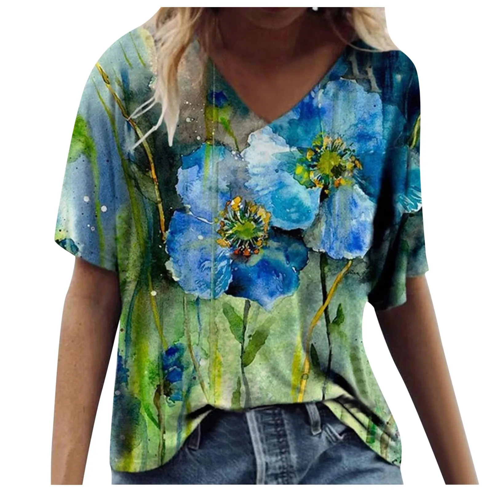 Женская футболка с коротким рукавом, V-образным вырезом и цветочным...