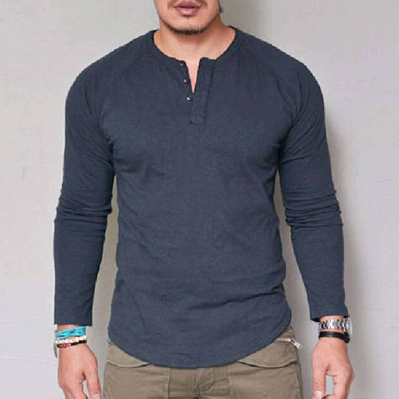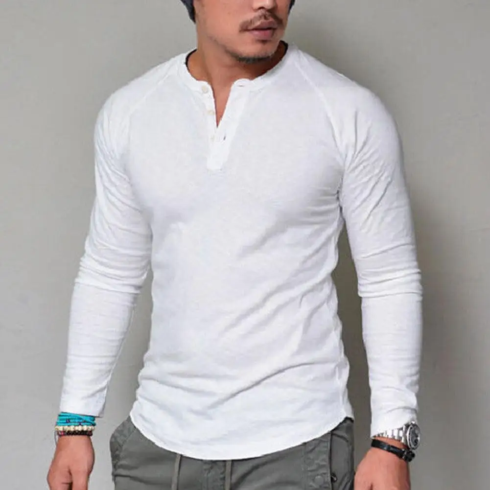 Мужская повседневная однотонная блузка с длинным рукавом, круглым вырезом и пуговицами, Тонкая блузка, футболка, повседневная одежда для свиданий, модный уличный Топ