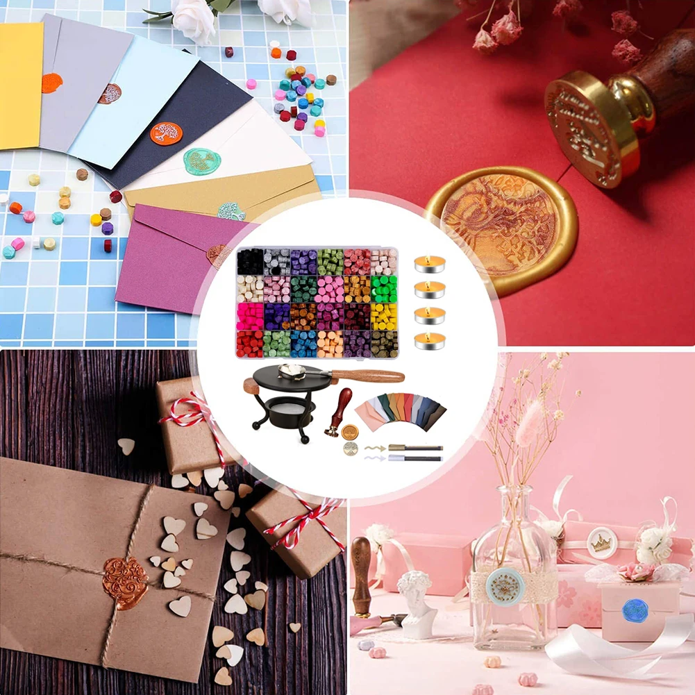 1 коробка восковых гранул (24 цвета * 25 шт.)10 X жемчужный конверт2 металлические ручки4 X белый воск1 х штамп с древом жизни и деревянной ручкой1 х Деревянная плавильная печь1 ложка из розового золота