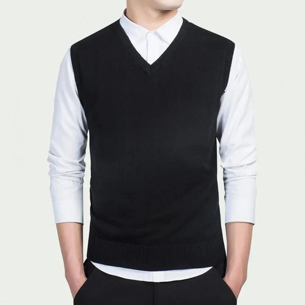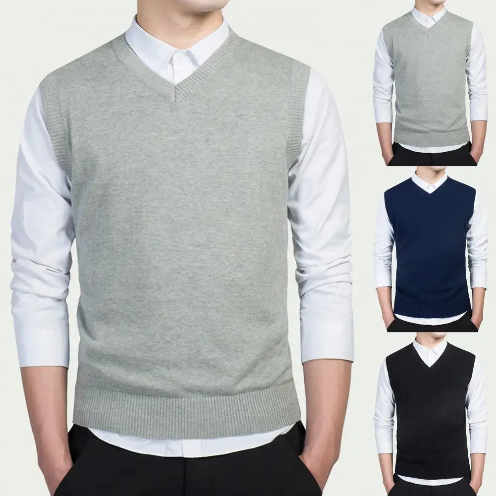 Мужской Хлопковый вязаный жилет, теплый жилет, однотонный, без рукавов, с V-образным вырезом, для осени и зимы