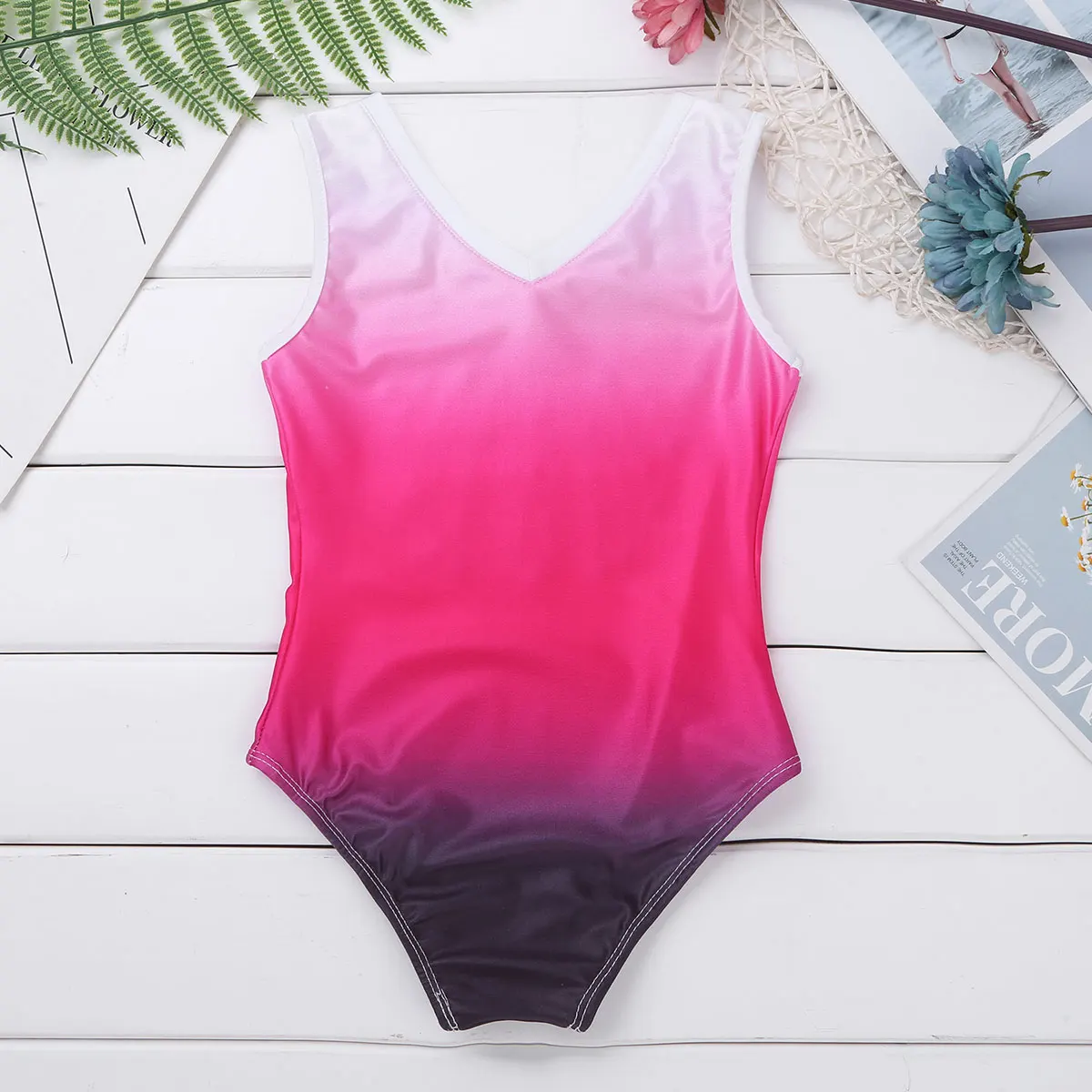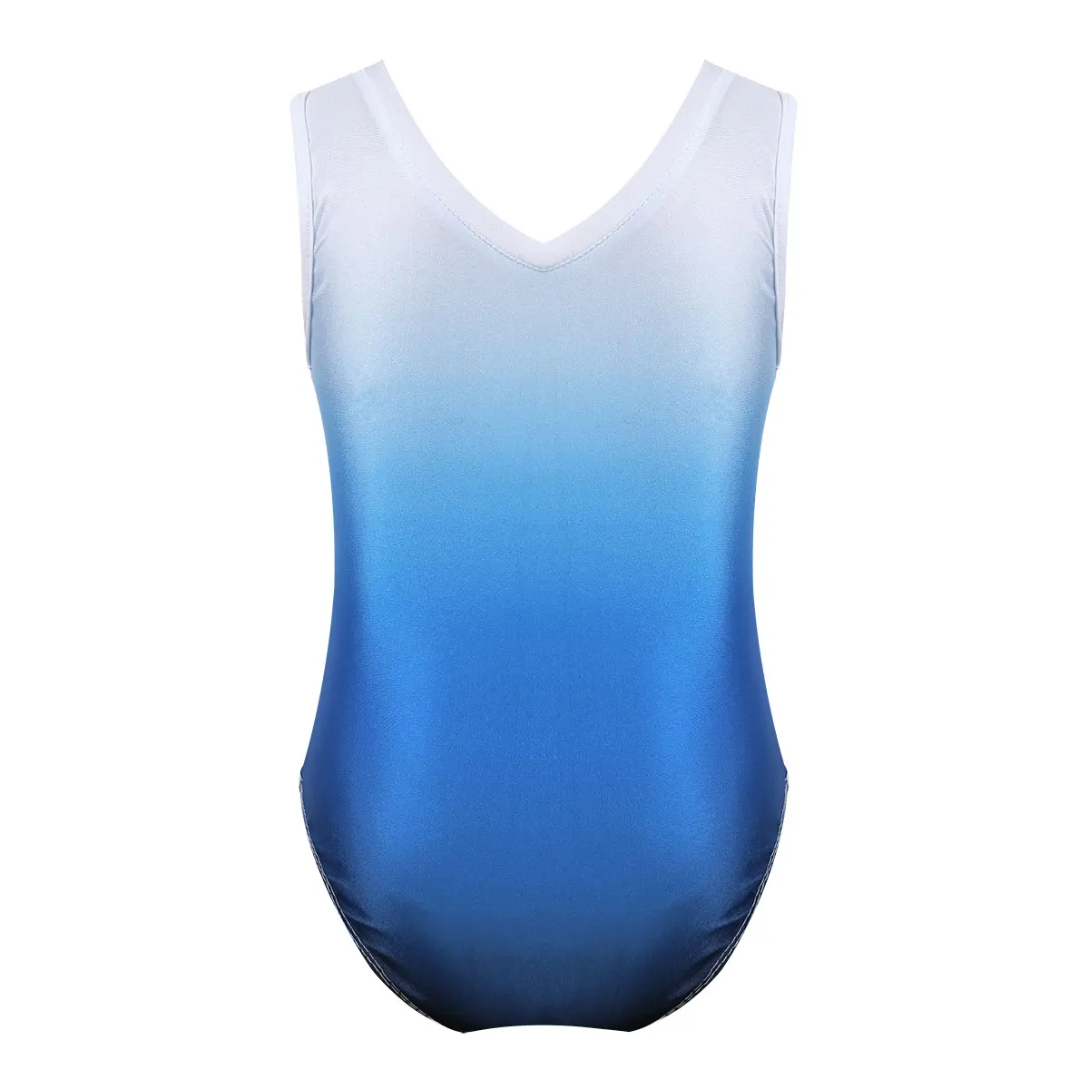 Детский цельный танцевальный Купальник для девочек, без рукавов, с V-образным вырезом, блестящий костюм Стразы для балета, Детский комбинезон для гимнастики