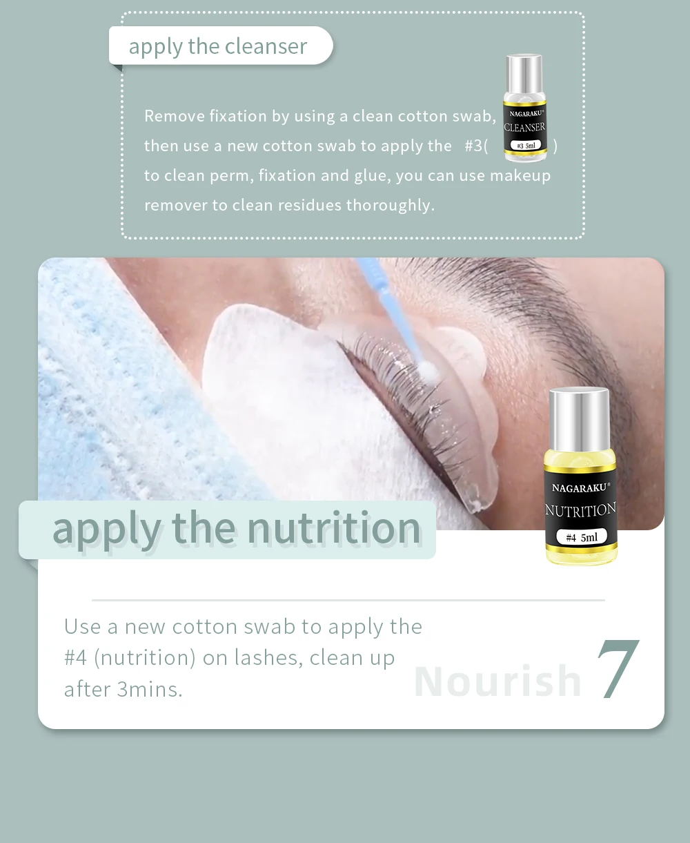Шаг 1, очистите ресницы, удалите остатки масла, пыли или макияжа. Скручивайте ресницы заранее, чтобы ресницы хорошо приклеились на подтягивающих подушечках.Шаг 2, выберите подходящие силиконовые подушечки (S,M или L), обрежьте по мере необходимости.Шаг 3. Нанесите клей на заднюю часть силиконовых подушечек, подождите 10 секунд и поместите подушечки на положение век, которое находится рядом с корнем натуральных ресниц.Удерживайте несколько секунд, пока подушечки не приклеятся к крышкам.Шаг 4. Нанесите клей на силиконовые подушечки, чтобы приподнимать ресницы, а затем подождите 10-20 секунд, пока клей будет уложен. Поднимите ресницы от корня y-кисточкой и убедитесь, что ресницы не перекрещиваются, прикрепите их к подушечкам и удерживайте ресницы на месте до тех пор, покаРесницы приклеиваются к подушечкам. Шаг 5, пожалуйста, откройте #1 (химическая завивка), а затем нанесите небольшое количество этого завивка крем от корня до центра ресниц с помощью кисти перед оформлением заказа.Время обработки: очень тонкие ресницы: 7-8mins, тонкие или тонированные ресницы: 8-10mins, здоровые ресницы: 10-12mins.Шаг 6, пожалуйста, откройте #2 (фиксации), а затем нанесите небольшое количество фиксации от корня до центра ресниц. Время обработки такое же, как и шаг 5 согласно клиентам.Шаг 7, снимите фиксацию с помощью чистого ватного тампона, затем используйте НОВЫЙ ватный тампон для нанесения #3 (очищающее средство) для очистки завивки, фиксации и клея, вы можете использовать Средство для снятия макияжа, чтобы тщательно очистить остатки.Шаг 8, используйте НОВЫЙ ватный тампон для нанесения #4 (питание) на ресницы, очиститеПосле 3 минут.