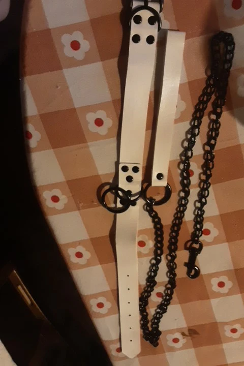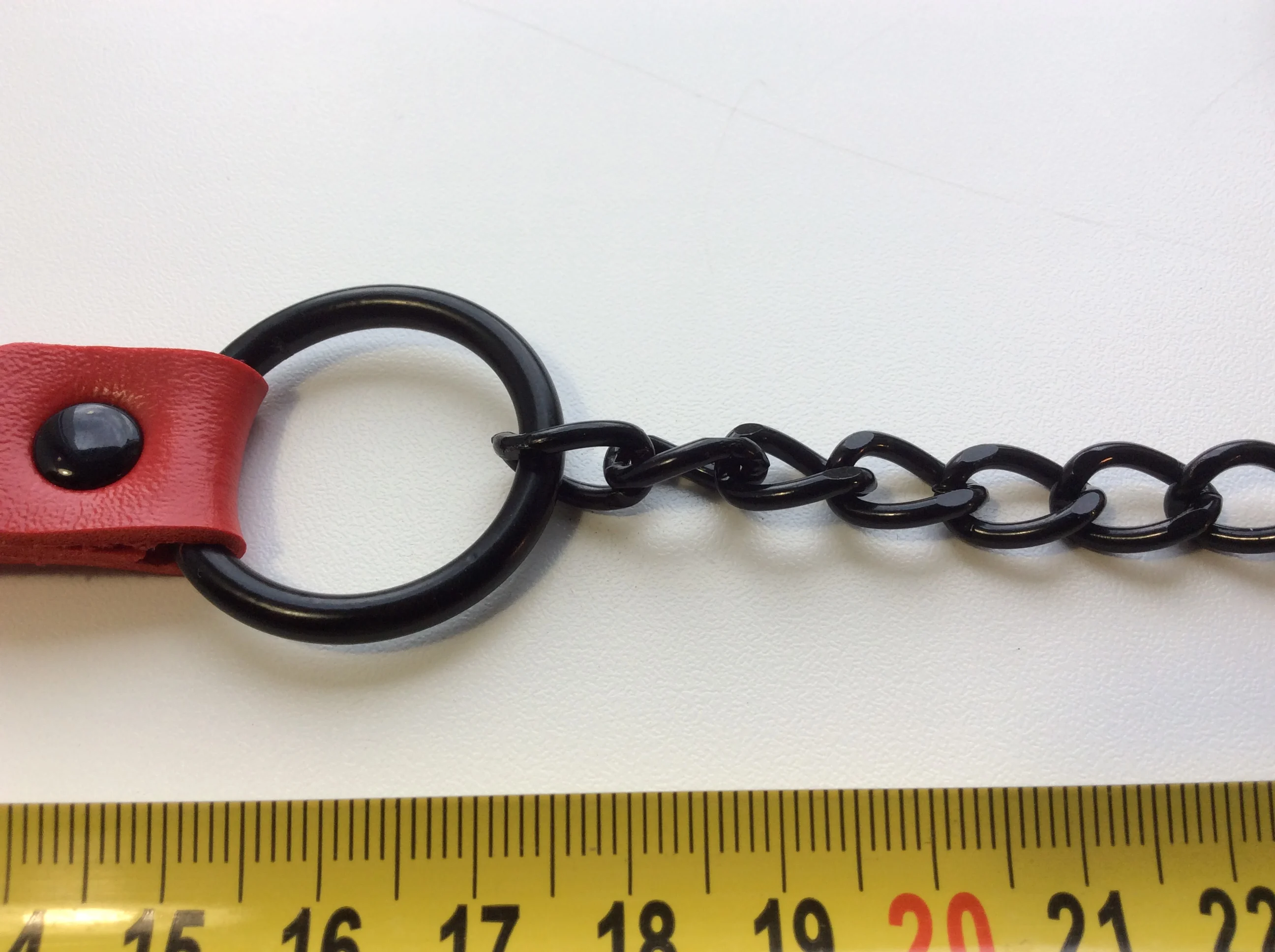 Качество самого чокера отличное, на шее сидит супер, а вот цепь не внушает особого доверия. Длина чокера: 45.5см, толщина 1.84мм, вес 47 грамм. Диаметр кольца для карабина: 3.74мм и 3.15мм для кольца держателя. Длина поводка с ручкой: 117.5см (вес 49 грамм), только ручки без кольца: ~15см, только цепочки без карабина: 95см - достаточно длинная. Клёпки и кольца магнитятся, а карабин и цепь нет (цепь из алюминия что-ли?). Чокер сам по себе очень хорош, из минусов - язычок пряжки малость тонковат, цепь не магнитится, выглядит хиленько и очень уж лёгкая - я поначалу даже подумал что она из пластика, но под царапинами на краске видно что металл. Благо цепь с карабинами можно купить отдельно в случае чего. Доехал за 15 дней.