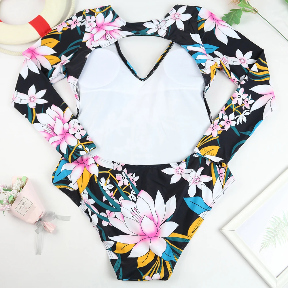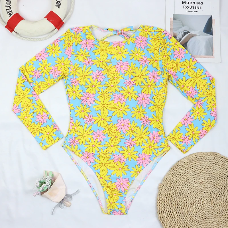 Новинка 2022, женский слитный купальник для серфинга с принтом ромашки, монокини с открытой спиной, одежда для плавания с длинными рукавами, женский летний костюм для серфинга