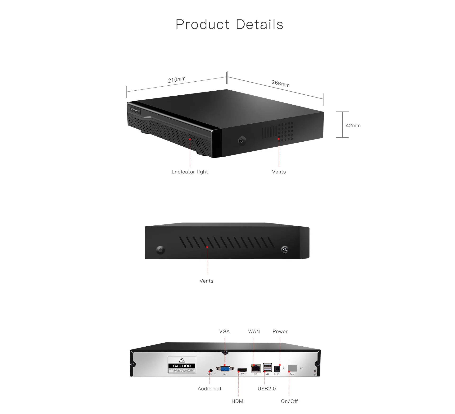 Питание: DC12V/2A Потребляемая мощность: 10 Вт (без HDD) Рабочая среда: -10 ~ + 55 °C / 10 ~ 90% RH / 86 ~ 106кпа Габариты (Ш * Г * В): 1U,255*244*42 (мм) Вес: 1,0-1,5 кг (без жесткого диска)