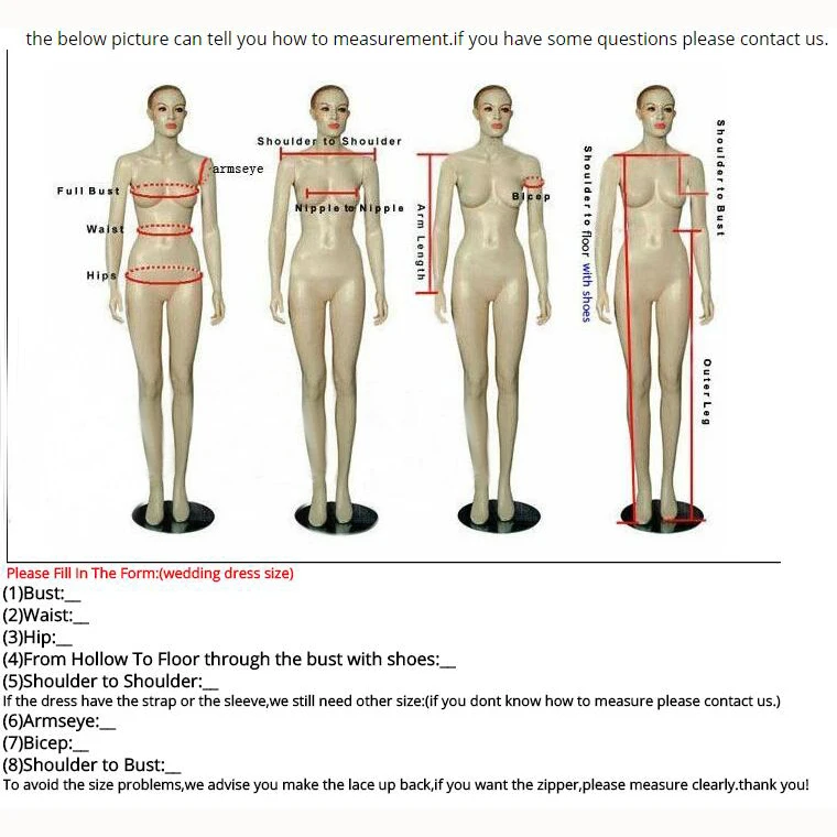 Примечание: размер, сделанный на заказ, является бесплатным. Вы можете сообщить нам свой размер в сообщении о заказе. При размещении заказа оставьте нам сообщение с указанием размера и цвета на заказ. Таким образом, мы можем увидеть цвет и размеры, которые вы хотите, когда мы получим заказ. О размере, вы можете выбрать стандартный размер на нашем сайте, или отправить нам свои собственные измерения, если вы хотите платье на заказ, сделанное по собственному размеру, пожалуйста, дайте нам размер следующим образом: 1. Обхват груди: = 2. Талия = 3. Бедра = 4. Верхний бюст = 5. Под грудью = 6. Соска-соска = 7. Длина спереди от плеча до груди = 8. От плеча до талии = 9. Длина от плеча до плеча = 10. Внешняя нога = (от талии до пола с вашей свадебной обувью) 11. От плеча до пола = (от плеча до пола с вашей свадебной обувью) 12. Цвет платья = Пожалуйста, сообщите нам цвет платья, когда вы размещаете заказ, если вы не выбрали цвет, один из показанных на картинке будет вашим выбором, спасибо :)