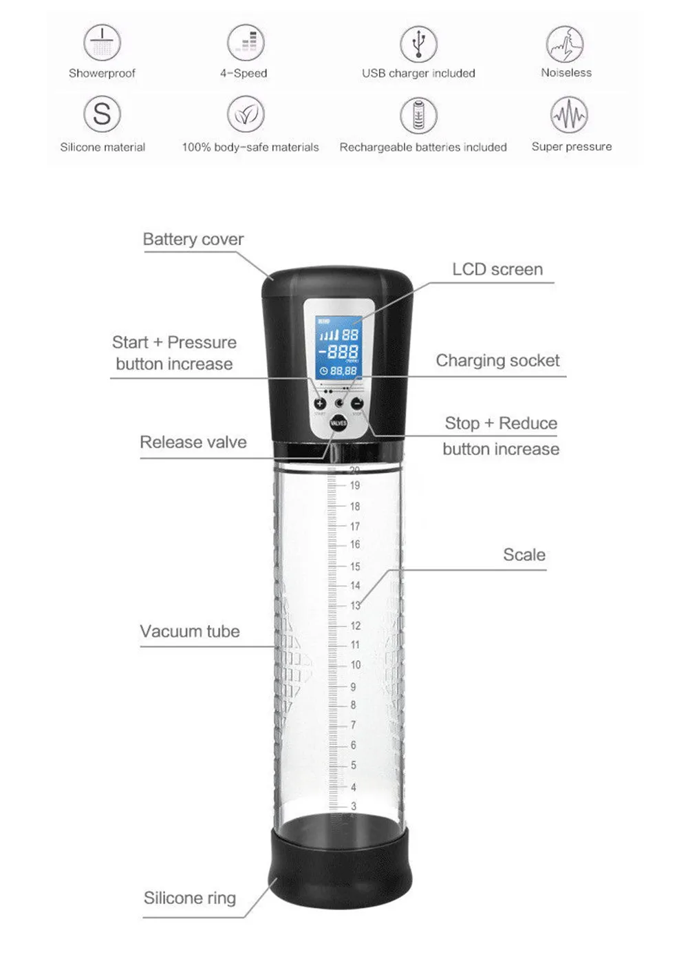 Это USB Перезаряжаемый автоматический насос для увеличения пениса с ЖК-дисплеем для мужчин, который может эффективно помочь вам достичь увеличения пениса для мужчин, что делает вас большим человеком! Изготовлен из превосходного медицинского материала, не ядовитый, безопасный и надежный.Особенности:Автоматический Электронный насос для пениса, секс игрушка продукт для мужчин, который может эффективно сделать пенис толще, дольше, сильнее.Изготовлен из превосходного медицинского материала, экологически чистый, без запаха, безопасный и неядовитый, без побочных эффектов на теле.Способствует циркуляции крови, помогает увеличить пенис и быстрое эрекцию.С ясным масштабом на прозрачной трубке вы сможете следить за ростом своего пениса при использовании этого расширительного насоса для пениса.С ЖК-дисплеем показывает значение давления, емкость аккумулятора и время использования.Автоматическое всасывание насоса, которое может полностью освободить руки, очень прост в использовании, и поддерживает 4 скорости всасывания для удовлетворения ваших потребностей.Съемная Воздушная трубка для легкой очистки, обеспечивая полный комфорт использования и гигиены.Характеристики:Тип: насос для пенисаМатериал: ABS + TPE + силиконАккумулятор: 2000 мАч литиевая батареяРазмер изделия: 295*69 мм/11,61*2,72 дюймаРазмер посылка: 300*80*80 мм/11,81*3,15*3,15 дюймовВес посылка: 415 г/14,64 унцийПосылка:1 * насос для пениса1 * USB кабель для зарядки