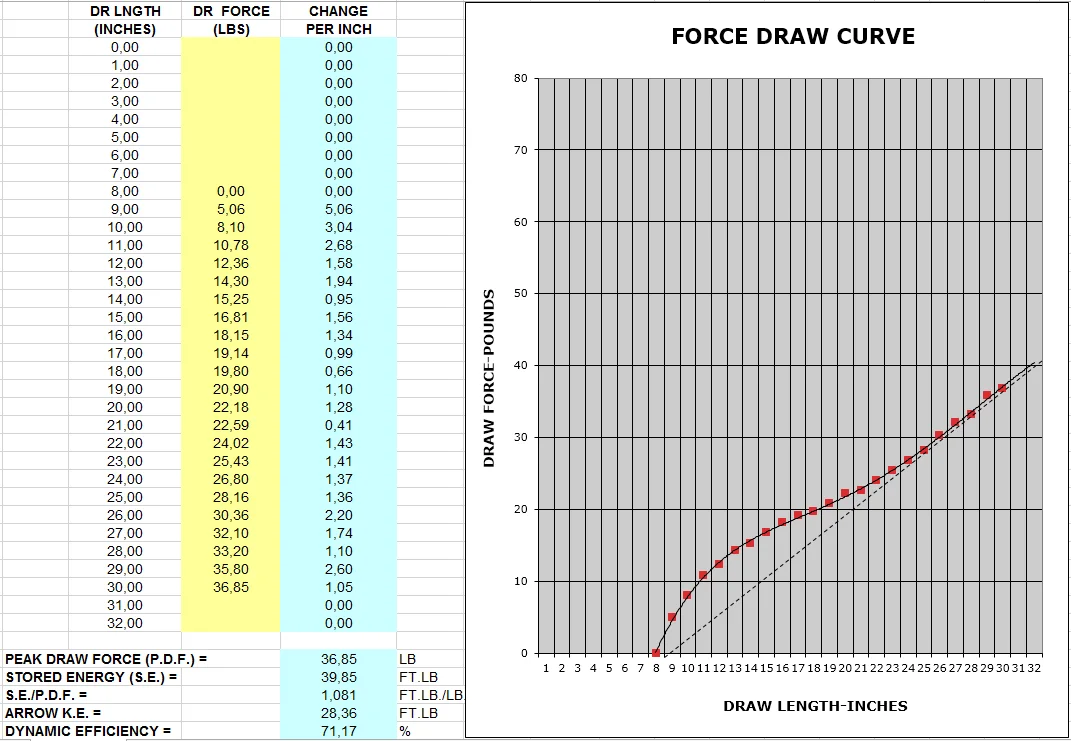 Коробка пришла мятой, сам лук в коробке был упакован в чехол, а концы плечей дополнительно обернуты пупыркой. О пришедшем экземпляре: вес 367 грамм (после ILF райзеров ощущается невесомым), длина тетивы 52,4", тетива, скорее всего, дакрон, нитки толстые (количество нитей не считал, но тут с избытком для 35lbs, дольше прослужит), база 7.5". Качество обработки плечей не идеальное, кое-где есть совсем мелкие пузырьки и шероховатости, но за свою цену, принимая во внимание, что это ламинированный лук - это не проблема. Характеристики на графике не точные, значения плавают, так как без подготовленного стенда (одному) замерять сложно, но общую картину составить можно, на 29-30" как раз и дает 35+lbs. На вид лук тоже приятный, тянется он мягко и намного приятнее, чем стеклопластиковые луки, настрел уже около 100+ стрел.
