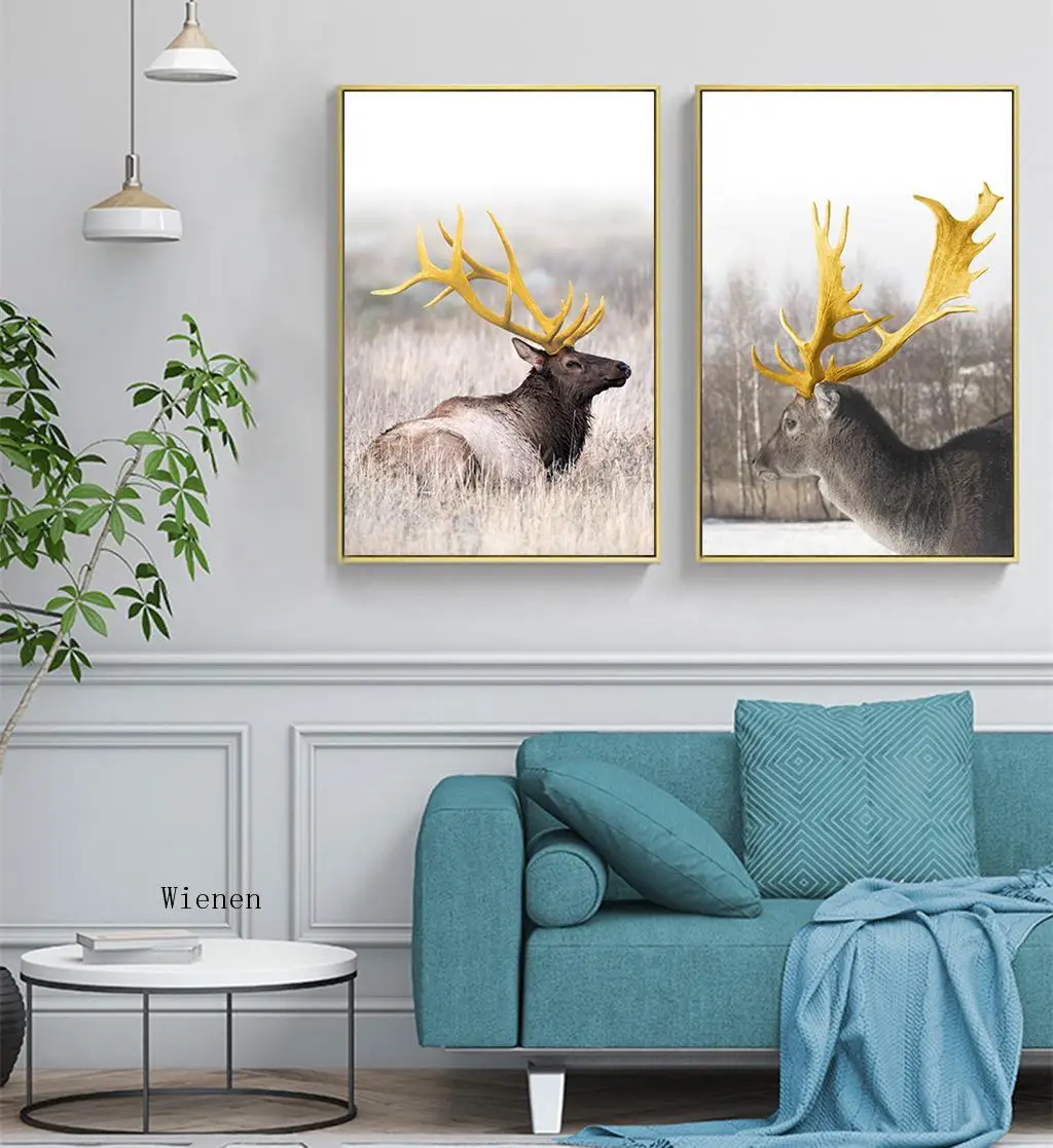 Постер в скандинавском стиле, абстрактная Геометрическая Золотая олень, лось, 3 шт., настенная Картина на холсте, Модульная картина для гостиной, домашний декор