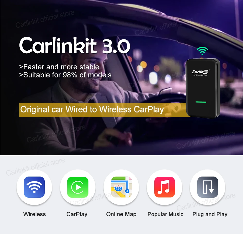 1. Легко установить, подключить и играть.2. Оригинальный автомобиль модернизирован, не меняя ничего в оригинальном автомобиле.3. Поддержка онлайн обновления для облегчения послепродажного обслуживания.4. Предварительная продажа: прибытие быстро, Европейский склад требует только 2-7 дней.5. Послепродажное обслуживание: официальные Аутентичные, 365 дней гарантии, профессиональное послепродажное обслуживание клиентов WhatsApp: + 86 181 2973 7153, Facebook: AE Carlinkit....==========================★Беспроводная CarPlay: сопряжение через Bluetooth и передача через WIFI.★Проводной CarPlay: сначала выключите WIFI и подключите через кабель (вы также можете зарядить свой телефон через кабель)