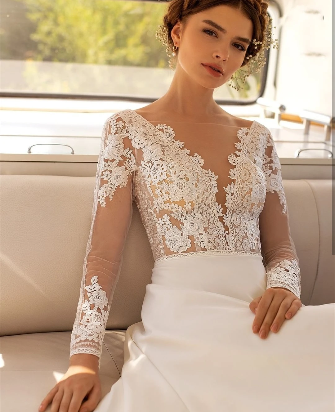 Женское свадебное светильник с длинными рукавами-фонариками и круже...