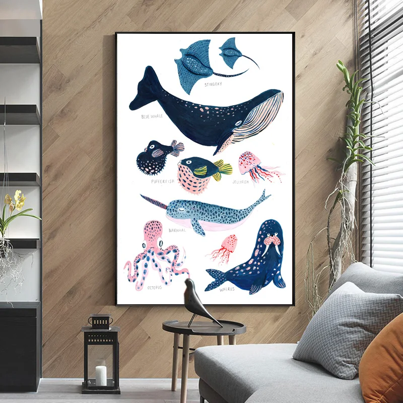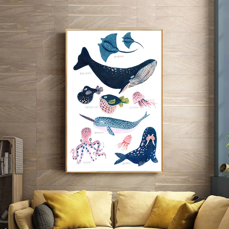 Современный плакат, морские животные, морские животные, рыбы, пинты, настенное искусство, холст, живопись, естественная картина для детской комнаты, детская комната, домашнее настенное искусство, Декор