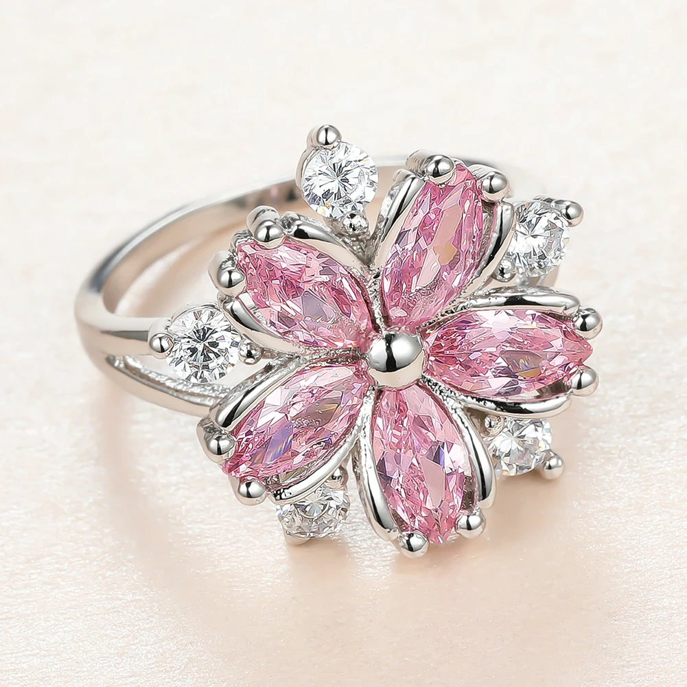 Милое женское кольцо розовый кристаллический камень, очаровательное серебряное обручальное кольцо для женщин, изящное обручальное кольцо с цветком из циркония для невесты