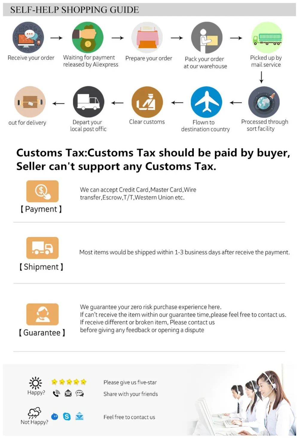 3. Покупатель должен оплатить таможенный налог, продавец не может поддерживать любой Таможенный налог. Когда вы размещаете заказ, пожалуйста, убедитесь, что ваш адрес верен, из-за неправильного адреса, откажитесь оплатить тариф, мы не несем ответственности за сбой доставки.