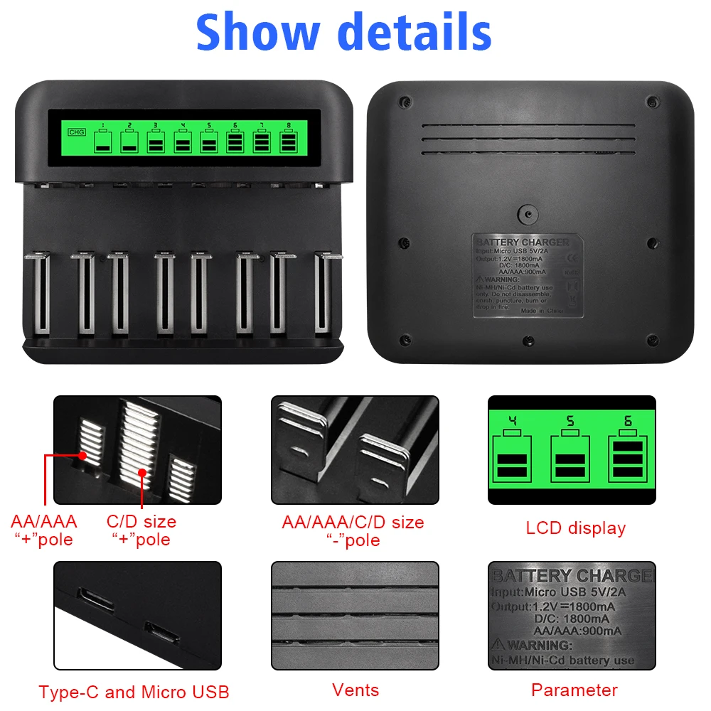 Спецификация:1. Зарядное устройство можно заряжать портативным зарядным устройством 1,2 V зарядное устройство для никель-кадмиевых или никель-металл-AAA / SC / C / D/никель-металл-гидридного/гидридных и никель-кадмиевых типов аккумуляторов аккумуляторные батареи.2. Быстрая зарядка и поддержка гибридной зарядки.3. ЖК-дисплей показывает процесс зарядки.4. Лучше всего использовать адаптер с большим током (> 2A)5. Двойной интерфейс micro-USB и type-C.6. Вход: DC 5V/2A, Выход AC/DC 1,2 V = 1800mA