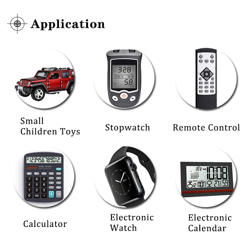 Лазерная указка, слуховые аппараты, Инсулиновые насосы, монитор сердечного ритма, часы, камеры, калькуляторы, автомобильная сигнализация безопасности, автомобильные пульты без ключа, органайзеры, глюкометры, компьютерное оборудование (запасная батарея памяти) CMOS, игрушки, коммуникативное оборудование, пакет данных для видеокамер и других устройств, которые требуют этого размера батареи