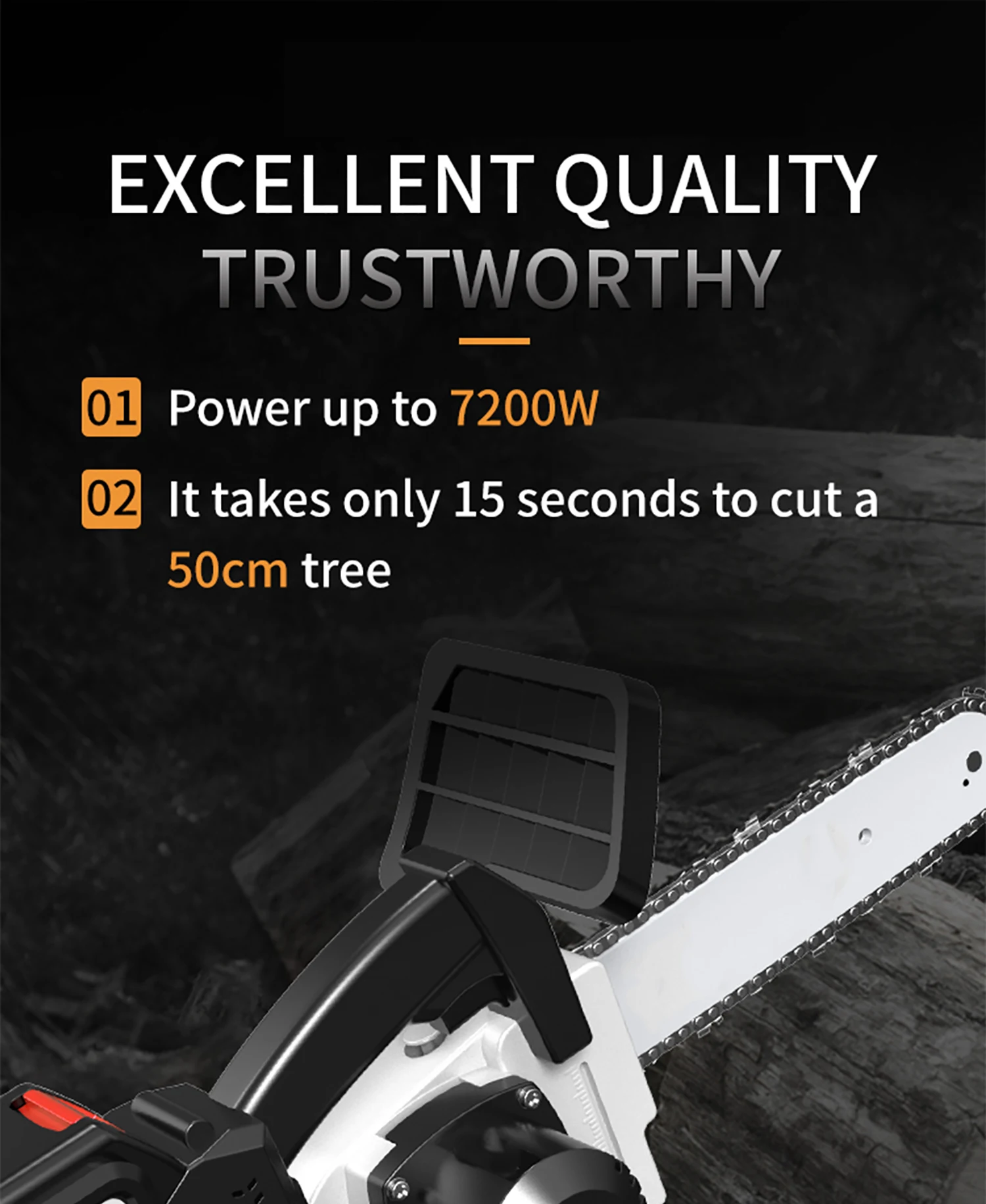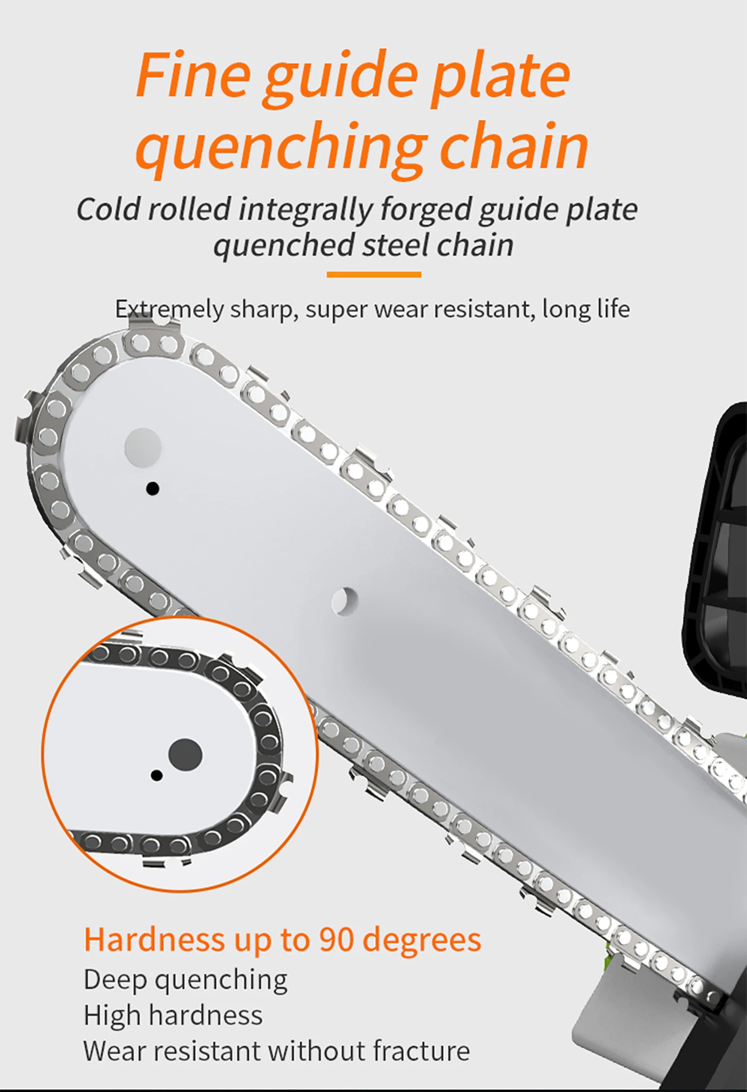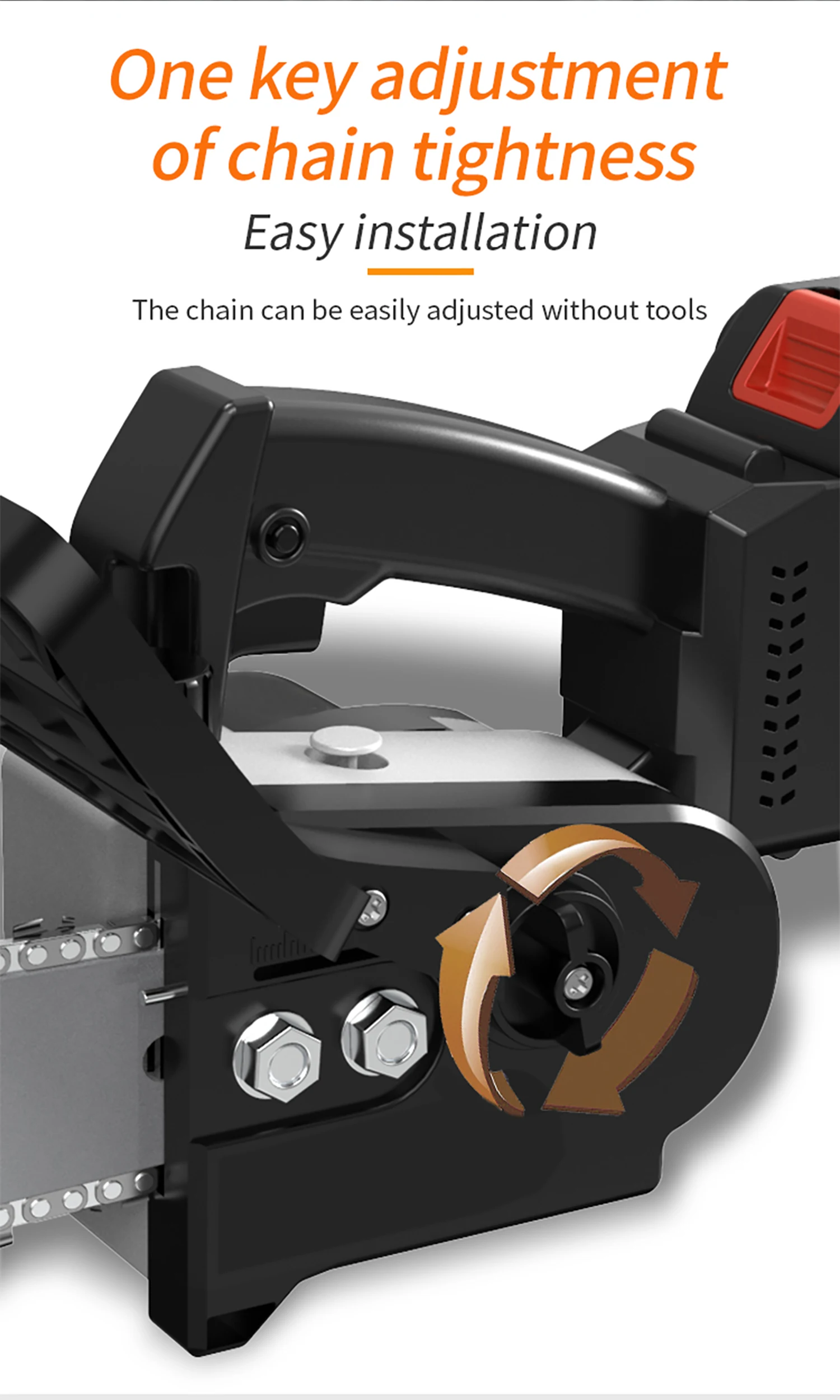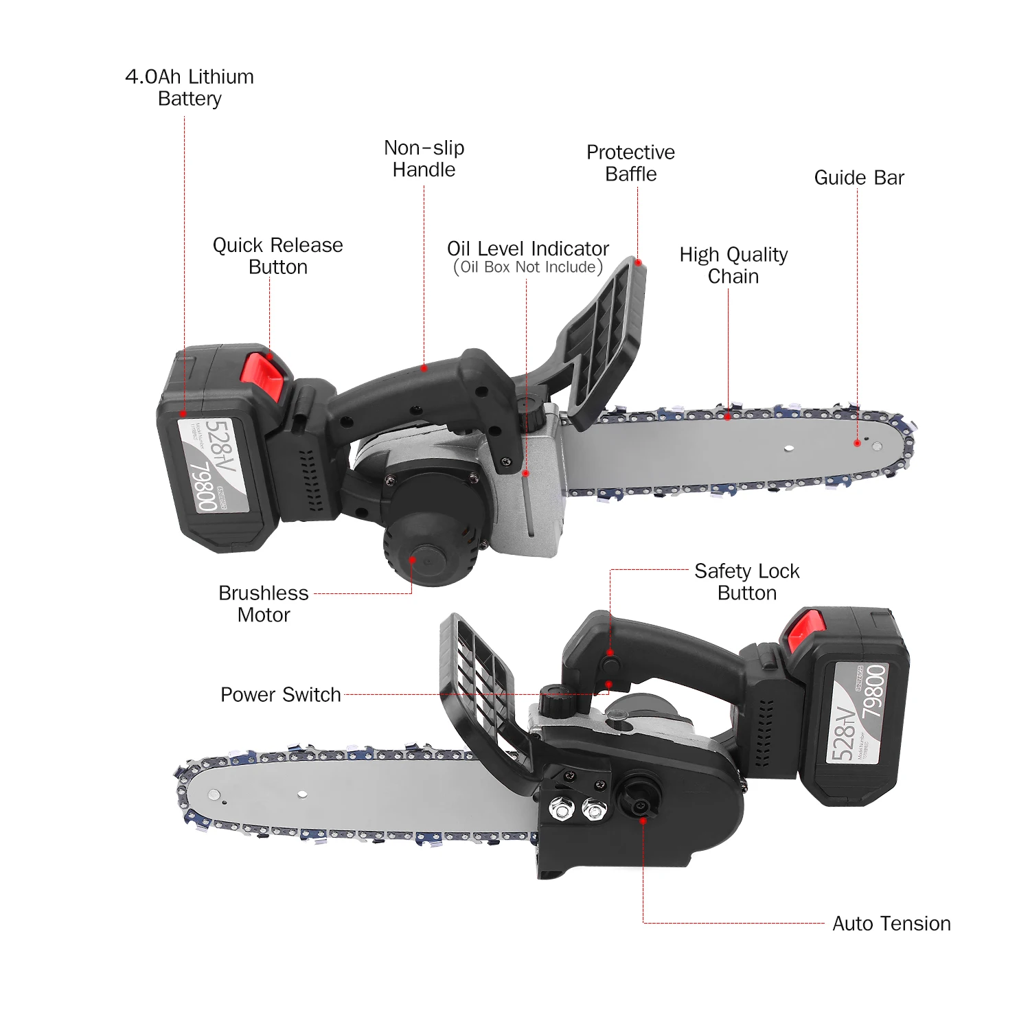 Особенности:Профессиональная бесщеточная бензопила-Мощный бесщеточный двигатель обеспечивает стабильную эффективность работы 10-дюймового стержня и цепи, позволяя с легкостью резать бревна и ветки диаметром от 0 до 8,66 дюймов. Идеально подходит для резки работ в саду или на ферме.Автоматическое Натяжение-автоматическое натяжение цепи обеспечивает более эффективный Быстрый разрез. Вы всегда будете иметь правильное напряжение и крутящий момент для каждой работы, автоматически.Смазка Цепи-система быстрого смазывания цепи от масла к стержню и цепи при необходимости для обеспечения долговечности и оптимального использования не только делает более плавный, эффективный срез, он продлевает срок службы инструмента. И с индикатором уровня масла для четкого обзора.Высокая скорость цепи-19,7 футов/с. Прорвется через любую подходящую величину бревна или ветки. Эта скорость в сочетании с нашими системами автоматического натяжения и автоматического масла, а также общая легкая конструкция обеспечивают плавную пилу.Мощный источник питания-528TV 21 в 6.0Ah литиевый аккумулятор время использования может до 270 мин при скорости холостого хода, а 3 часа быстрой зарядки обеспечивают длительное время работы вне помещения. Пила без газа и шнура, много меньше Муса и суеты.Спецификация:Название товара: литиевая цепная пилаЦвет: черныйВилка: ЕС/США/Великобритания (опционально)Номинальное напряжение: 21 вЕмкость аккумулятора:6,0 АчВремя зарядки: около 3 часовДлина направляющей пластины: 310 ммМаксимальный диаметр реза: 230 ммСкорость цепи: 6 м/сКомплектация:1 * Беспроводная цепная пила (требуется сборка)1 / 2*6,0 Ач Аккумулятор1 * быстрое зарядное устройство1 * Руководство пользователя1 * коробка для хранения