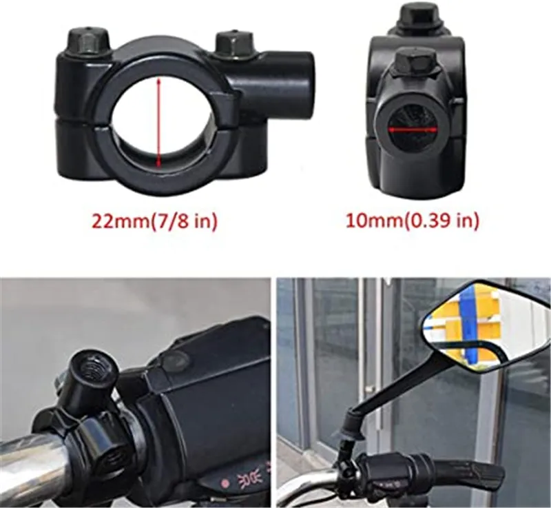 ★【Фитинг】 С резьбовым болтом 10 мм по часовой стрелке и зажимом для крепления на руль 7/8 ", совместим с большинством мотоциклов, уличных велосипедов, квадроциклов, грязевых велосипедов, квадроциклов питбайка, велосипедов и скутеров, таких как Aprilia, BMW, Buell, Ducati, Honda, Indian, Kawasaki, Suzuki, Triumph и Yamaha и многое другое.
