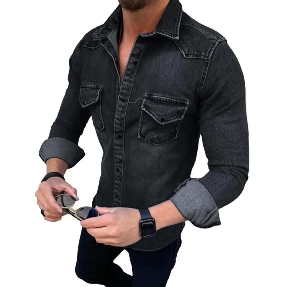 Рубашка мужская джинсовая с длинными рукавами, мягкая хлопковая эластичная облегающая сорочка из денима с двумя карманами, весна-осень