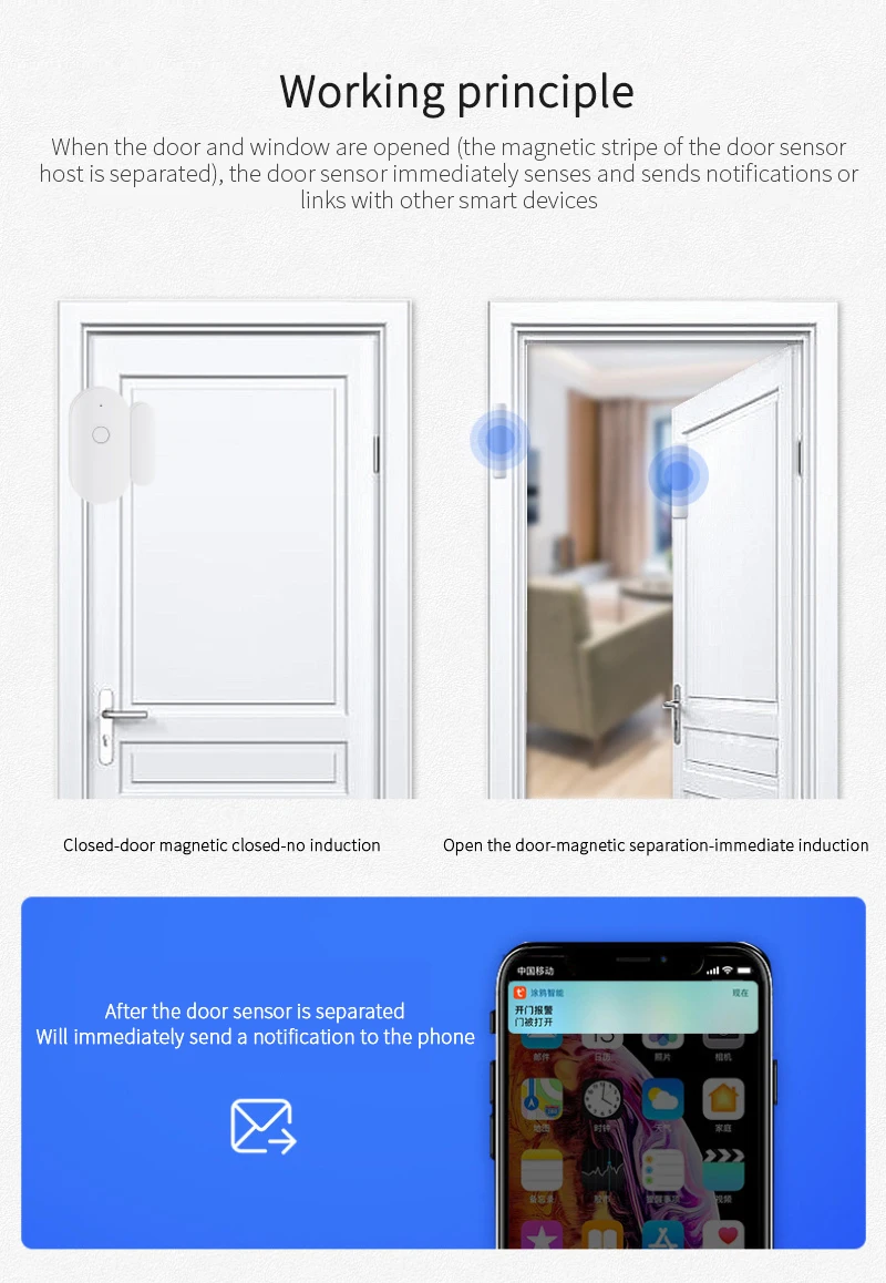 【Обнаружение состояния двери/окна 】когда дверь/окно открыта или закрыта, устройство срабатывает и push-уведомление на телефон.