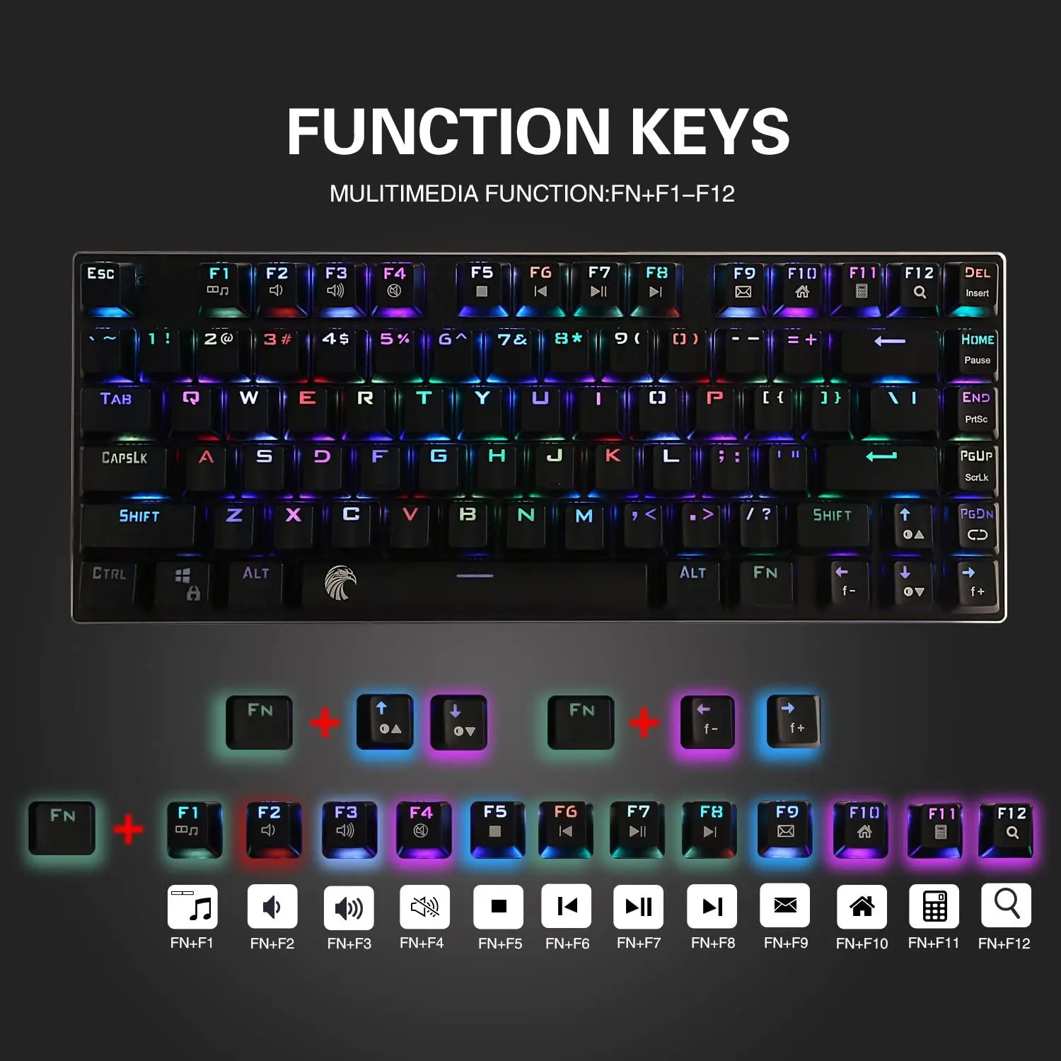Легко использовать Входящий в комплект Съемник колпачка для легкой очистки и обслуживания. Привод не требуется. Подключи и играй. RGB светодиодная подсветка Chroma Dimmable FN + PGDN: 10 режимов черного света, чтобы получить красивый вид на своем столе. N-key опрокидывание Защита от ореолов 81 клавиша. Каждая кнопка управляется независимым переключателем, что дает вам очень точный отклик даже при одновременном нажатии нескольких клавиш. Идеально подходит для геймеров, машинисток. Синие переключатели DIY Благодаря синим переключателям он обеспечивает щелкающую и тактильную обратную связь, чувствительную и отзывчивую. Все клавиши поддерживают замену переключателя «сделай сам». Компактный дизайн Благодаря 81 клавишам он сэкономит много места на вашем столе. Размер меньше, управление проще. Функциональная клавиша ярлыков Он доступен для калькулятора, электронной почты, веб-браузера, громкости, мультимедиа и т. д. нажатием FN + F1-F12. Широкая совместимость Совместим с Windows 10,Windows 8, Windows 7, Mac OS X, Windows XP, Windows VISTA и т. д.Особенность:Металлическое основание, высококачественный АБС-пластик, лазерная гравировка, нескользящая конструкция, защита от брызг и долговечность.Колпачок: уникальная двухцветная форма для прочных колпачков ключейДолговечность ключа: до 50 миллионов нажатийПрофиль ключа: 4,0 +/-0,2 ммСила ключа: 60 +/-15 гТип ключевого переключателя: синие механические переключателиЖирный USB-кабель 1,8 м, можно заменить Содержимое упаковки1 механическая клавиатура1 Руководство пользователя1 Съемник колпачков