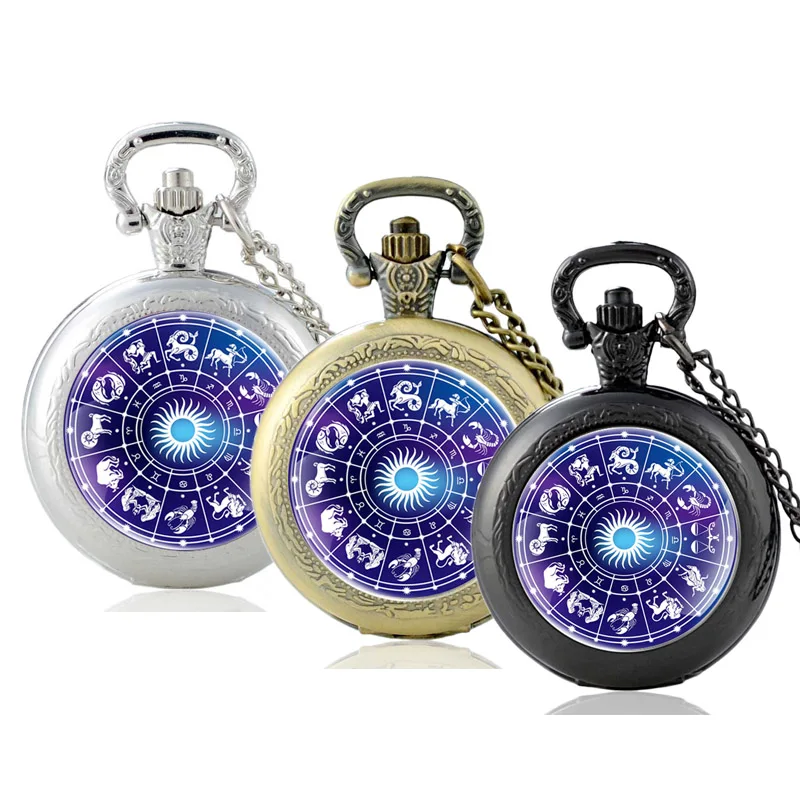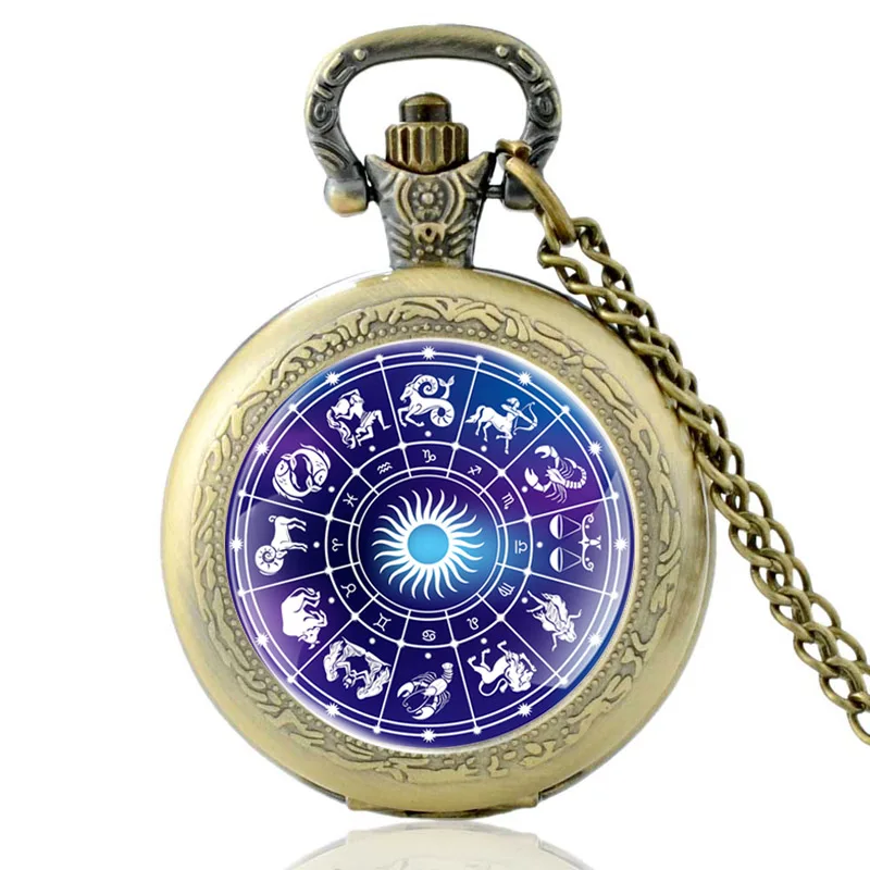 Классические кварцевые карманные часы с кабошоном из астрологического стекла с двенадцатью созвездиями, винтажные мужские и женские часы с подвеской на цепочке и ожерельем, часы