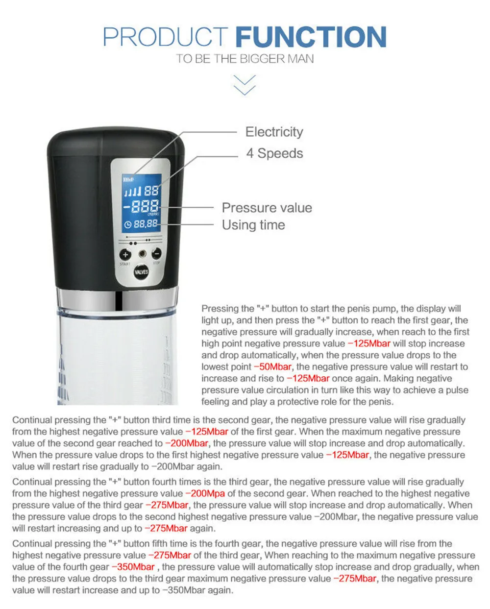 Это USB Перезаряжаемый автоматический насос для увеличения пениса с ЖК-дисплеем для мужчин, который может эффективно помочь вам достичь увеличения пениса для мужчин, что делает вас большим человеком! Изготовлен из превосходного медицинского материала, не ядовитый, безопасный и надежный.Особенности:Автоматический Электронный насос для пениса, секс игрушка продукт для мужчин, который может эффективно сделать пенис толще, дольше, сильнее.Изготовлен из превосходного медицинского материала, экологически чистый, без запаха, безопасный и неядовитый, без побочных эффектов на теле.Способствует циркуляции крови, помогает увеличить пенис и быстрое эрекцию.С ясным масштабом на прозрачной трубке вы сможете следить за ростом своего пениса при использовании этого насоса-расширителя.С ЖК-дисплеем показывает значение давления, емкость аккумулятора и время использования.Автоматическое всасывание насоса, которое может полностью освободить руки, очень прост в использовании, и поддерживает 4 скорости всасывания для удовлетворения ваших потребностей.Съемная Воздушная трубка для легкой очистки, обеспечивая полный комфорт использования и гигиены.Характеристики:Тип: насос для пенисаМатериал: ABS + TPE + силиконАккумулятор: 2000 мАч литиевая батареяРазмер изделия: 295*69 мм/11,61*2,72 дюймаРазмер посылка: 300*80*80 мм/11,81*3,15*3,15 дюймовВес посылка: 415 г/14,64 унцийПосылка:1 * насос для пениса1 * USB кабель для зарядки