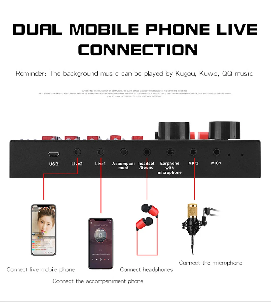 8. Вы можете использовать масштабное аудио оборудование для использования двух мобильных телефонов одновременно. Музыкальные инструменты, гитары, клавиатуры и другие сопровождения.