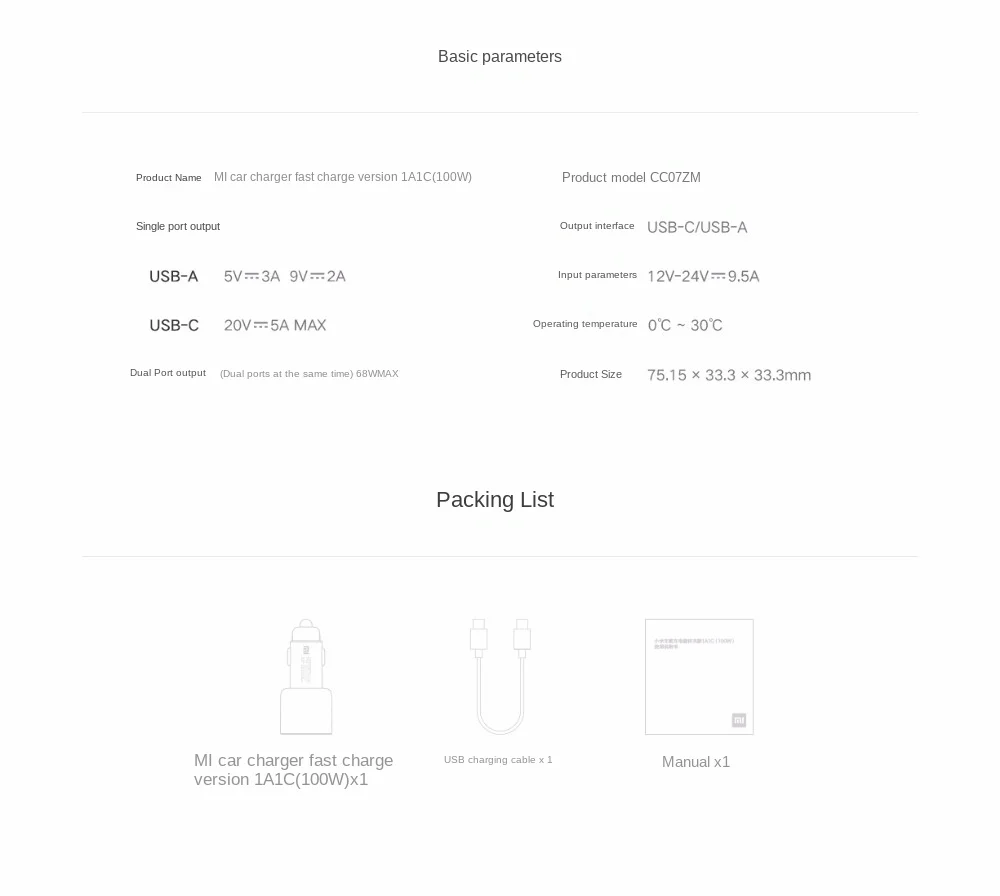 Автомобильное зарядное устройство Xiaomi, быстрая зарядка, версия 1A1C, 100 Вт, , 100 Вт, максимальная Быстрая зарядкателефон, двойной порт вывода