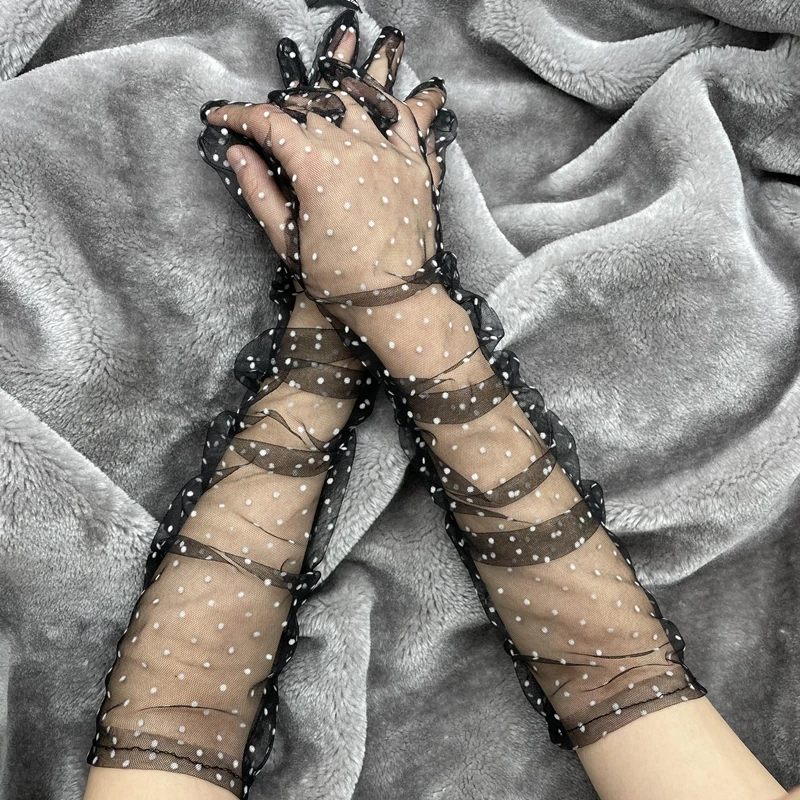 Длинные кружевные перчатки в горошек, женские тюлевые сетчатые черн...