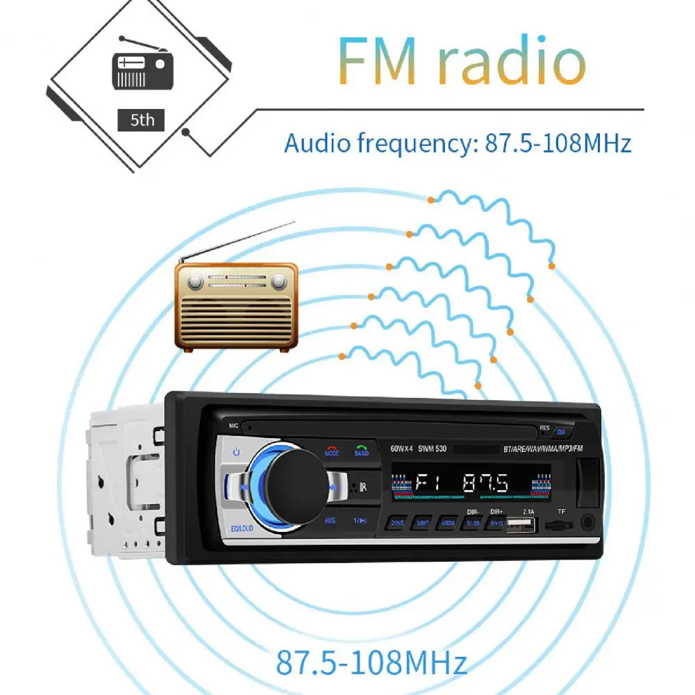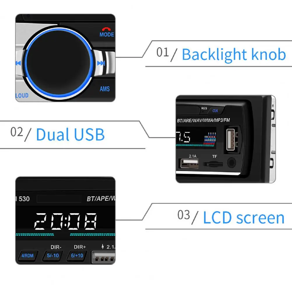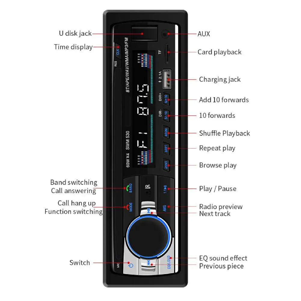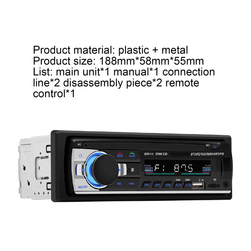 SWM-530 двойной USB телефон зарядка FM радио/AUX/U диск/Bluetooth/воспроизведение карт 12 в автомобильный mp3-плеер Описание: Mp3-плеер использует интеллектуальное беспроводное соединение Bluetooth, работа более удобная и быстрая. Имеет четыре режима воспроизведения AUX/U диска/Bluetooth/карты. Вы можете наслаждаться музыкой во время зарядки телефона. Он имеет функцию звукового эффекта эквалайзера, и вы можете выбрать из популярного/Рок/классического режима. Он имеет функцию отображения времени, одна кнопка для переключения отображения времени для управления в реальном времени. Он имеет функцию отключения памяти, автоматическую память после отключения питания и автоматический круиз. Изготовлен из высококачественного материала, прочен и долговечен в использовании. Длина изделия 188 мм, ширина 58 мм, высота 55 мм. Универсально подходит для любого автомобиля. Название товара: автомобильный mp3-плеер Материал: пластик, металл Батарейки: встроенный аккумулятор пульта дистанционного управления: CR2025 150 мАч (входит в комплект) Напряжение питания: 12 В постоянного тока Bluetooth: Bluetooth 4,0 (пароль: 0000) Модель чипа декодирования: для Jerry4900 Аудиоформат: MP3/WMA/WAV/FLACRCA Порт подключения: два выхода RCA, красный и белый разъем Lotus Интерфейс USB: двойной USB, USB1: чтение песен с U-диска, USB2: Зарядка телефона Экран: LCD VA Частота FM-радио: 87,5-108 МГц Радиодиапазон: FM1/FM2/FM3 Слот для карты: TF-карта Радиочип: QN8035 Чип усилителя мощности: TDA7377 Светильник кнопки: синий светильник Мобильная зарядка: для Android/IOS Время: 24-часовая система Вход AUX: Поддержка Кнопка сброса: Да Размер: 18,8 см x 5,8 см x 5,5 см/дюйма x дюйма Примечания: Из-за разницы в освещении и настройках экрана цвет изделия может немного отличаться от изображения. Возможны незначительные различия в размерах из-за различий в измерениях вручную. Посылка входит: 1 х пульт дистанционного управления 2 х разборные полоски 2 х соединительные линии 1 х Руководство пользователя 1 автомобильный mp3-плеер