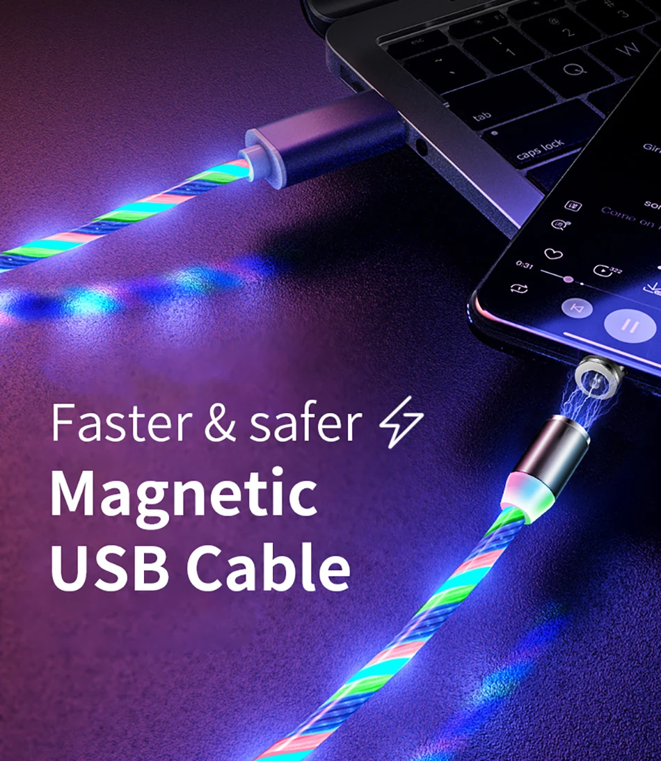 Магнитный кабель Micro USB Type-C, светящийся, со светодиодной подс...