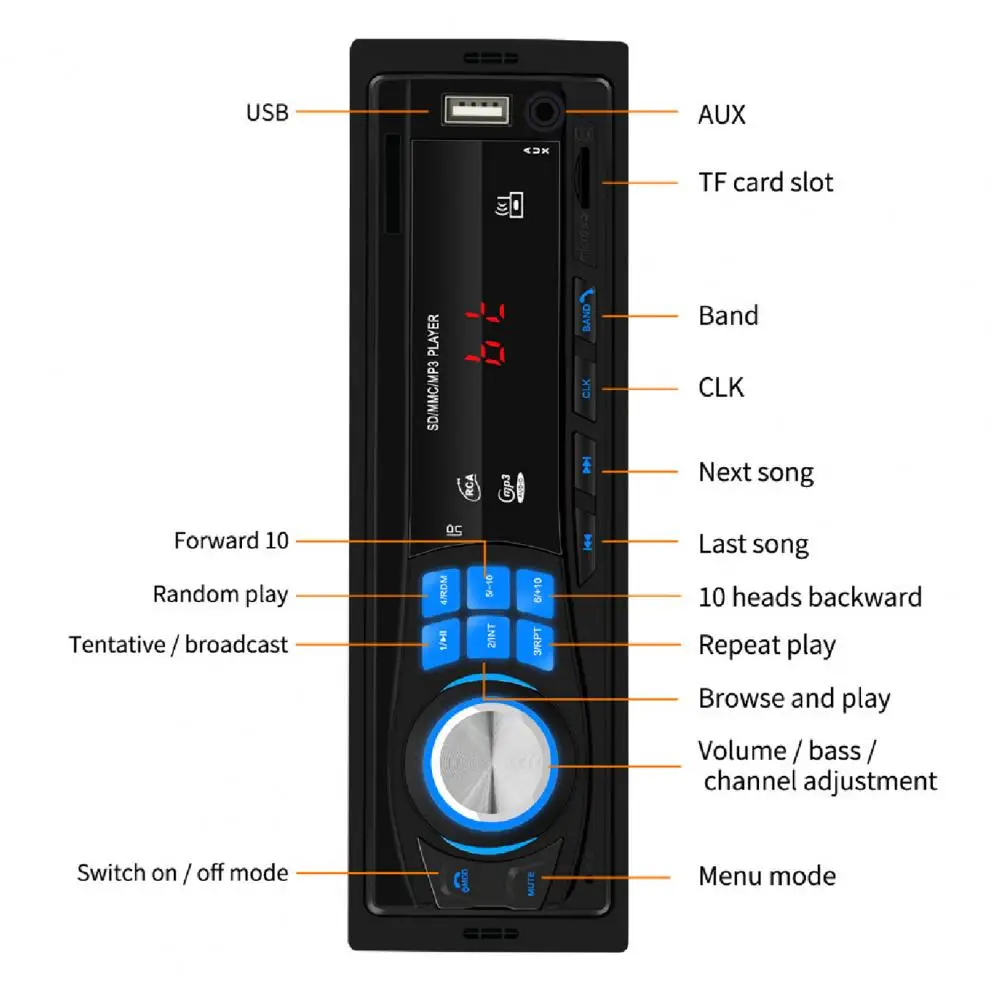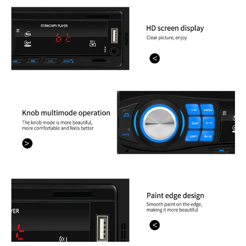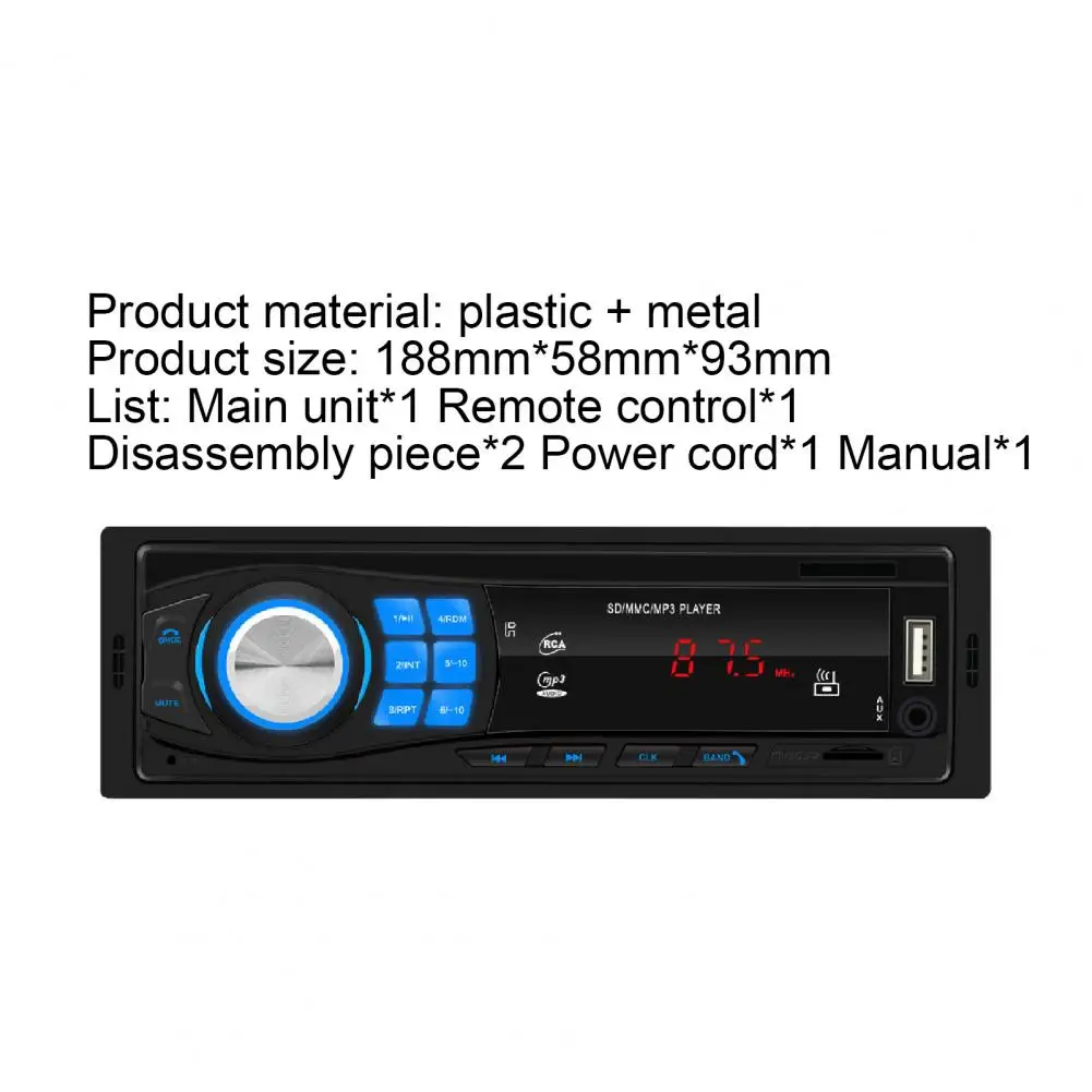8013 MP3-плеер Bluetooth громкой связи AUX/Micro-SD/U диск/FM радио 12 в автомобильный 1 Din USB2.0 MP3-плеер Описание: Благодаря интеллектуальному чипу он имеет низкое энергопотребление и сильный сигнал. Он имеет четырехканальный выход, который может восстановить эффект живого звука, независимые регулировки высоких и низких частот, чтобы сделать звук более высоким и глубинным. Функция громкой связи позволяет освободить руки. Звуковой эффект эквалайзера имеет Популярные/Рок/классические режимы на выбор. С отображением времени вы можете переключать Отображение времени одной кнопкой. Он имеет функцию отключения памяти и поддерживает множество способов воспроизведения. Изготовлен из высококачественного материала, прочен и долговечен в использовании. Длина изделия 188 мм, высота 58 мм, глубина 93 мм. Универсально подходит для любого автомобиля. Название товара: автомобильный mp3-плеер Материал: пластик, металл Батарейки: встроенный аккумулятор пульта дистанционного управления: CR2025 150 мАч (входит в комплект) Интерфейс USB: передняя панель USB2.0 Формат поддержки: MP3 Словосочетасветодиодный Поддержка входа: AUX, карта Micro-SD, U-диск, аудио Пульт дистанционного управления Bluetooth: пульт дистанционного управления картой Терминал RCA: 1-канальный аудиовыход Размер: 18,8 см x 5,8 см x 9,3 см/дюйма x дюйма Примечания: Из-за разницы в освещении и настройках экрана цвет изделия может немного отличаться от изображения. Возможны незначительные различия в размерах из-за различий в измерениях вручную. Посылка входит: 1 автомобильный mp3-плеер 1 х пульт дистанционного управления 2 X инструменты 1 шнур питания 1 х Руководство пользователя