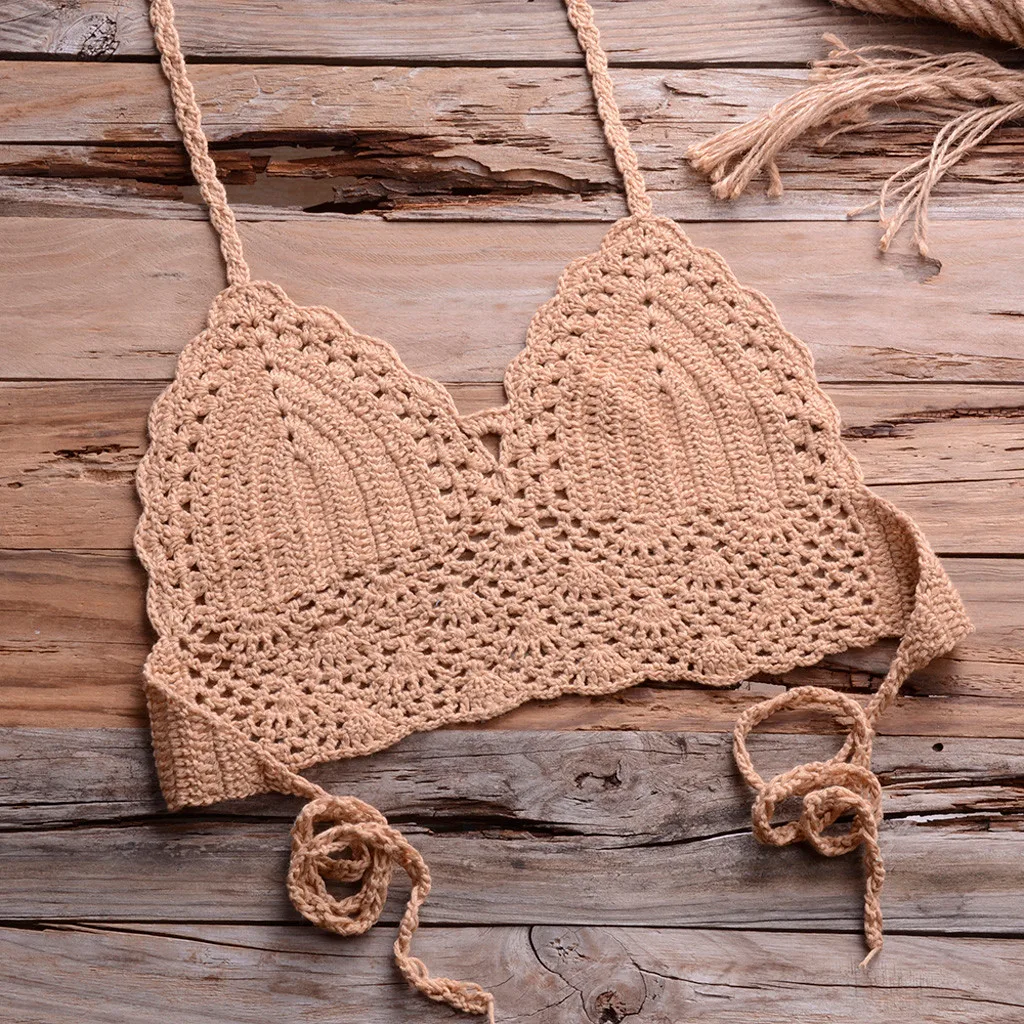 Новинка 2021, Топ Бикини ручной работы, вязаный крючком Женский Пляжный Бралетт в стиле бохо, однотонный вязаный купальник с лямкой на шее, бразильские бикини, купальный костюм, Топ