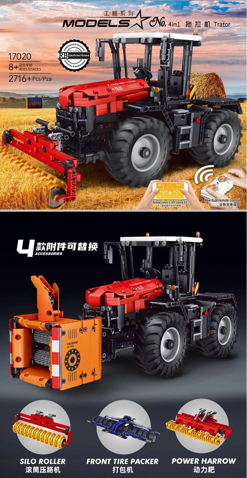 Высокотехнологичный автомобиль MOULD KING 17020 APP, игрушки, Радиоуправляемый моторизованный тратор с роликовым упаковщиком, борона, строительные блоки, детали, подарок для детей